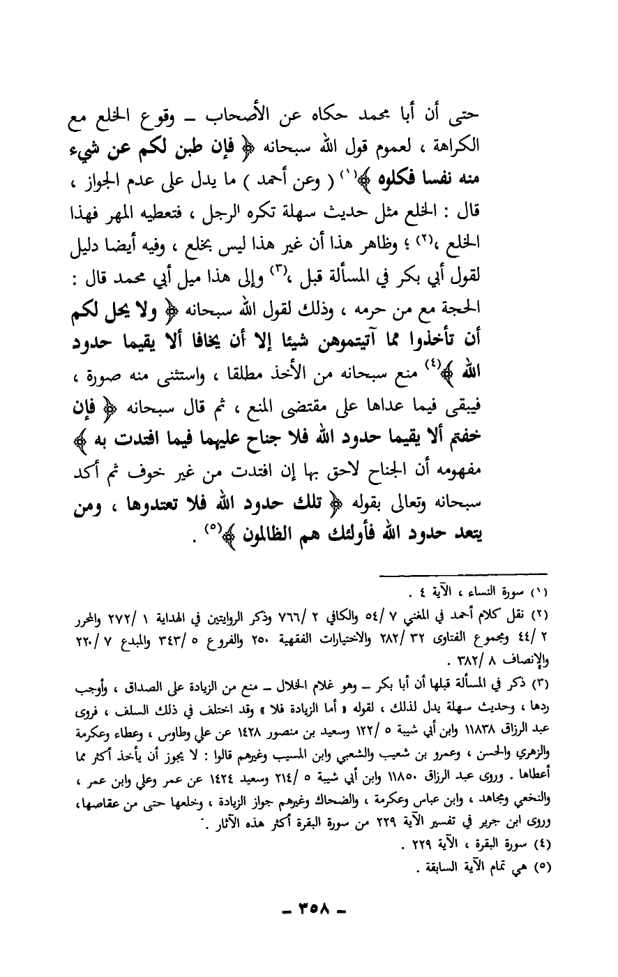 حتى أن أبا محمد حكاه عن الأصحاب - وقوع الخلع مع الكراهة، لعموم قول الله سبحانه: {فَإِنْ طِبْنَ لَكُمْ عَنْ شَيْءٍ مِنْهُ نَفْسًا فَكُلُوهُ} [النساء: 4] (وعن أحمد) ما يدل على عدم الجواز، قال: الخلع مثل حديث سهلة تكره الرجل، فتعطيه المهر فهذا الخلع، وظاهر هذا أن غير هذا ليس بخلع، وفيه أيضا دليل لقول أبي بكر في المسألة قبل، وإلى هذا ميل أبي محمد قال: الحجة مع من حرمه، وذلك لقول الله سبحانه: {وَلَا يَحِلُّ لَكُمْ أَنْ تَأْخُذُوا مِمَّا آتَيْتُمُوهُنَّ شَيْئًا إِلَّا أَنْ يَخَافَا أَلَّا يُقِيمَا حُدُودَ اللَّهِ} [البقرة: 229] منع سبحانه من الأخذ مطلقا، واستثنى منه صورة، فيبقى فيما عداها على مقتضى المنع، ثم قال سبحانه: {فَإِنْ خِفْتُمْ أَلَّا يُقِيمَا حُدُودَ اللَّهِ فَلَا جُنَاحَ عَلَيْهِمَا فِيمَا افْتَدَتْ بِهِ} [البقرة: 229] مفهومه أن الجناح لاحق بها إن افتدت من غير خوف ثم أكد سبحانه وتعالى بقوله: {تِلْكَ حُدُودُ اللَّهِ فَلَا تَعْتَدُوهَا وَمَنْ يَتَعَدَّ حُدُودَ اللَّهِ فَأُولَئِكَ هُمُ الظَّالِمُونَ} [البقرة: 229] .