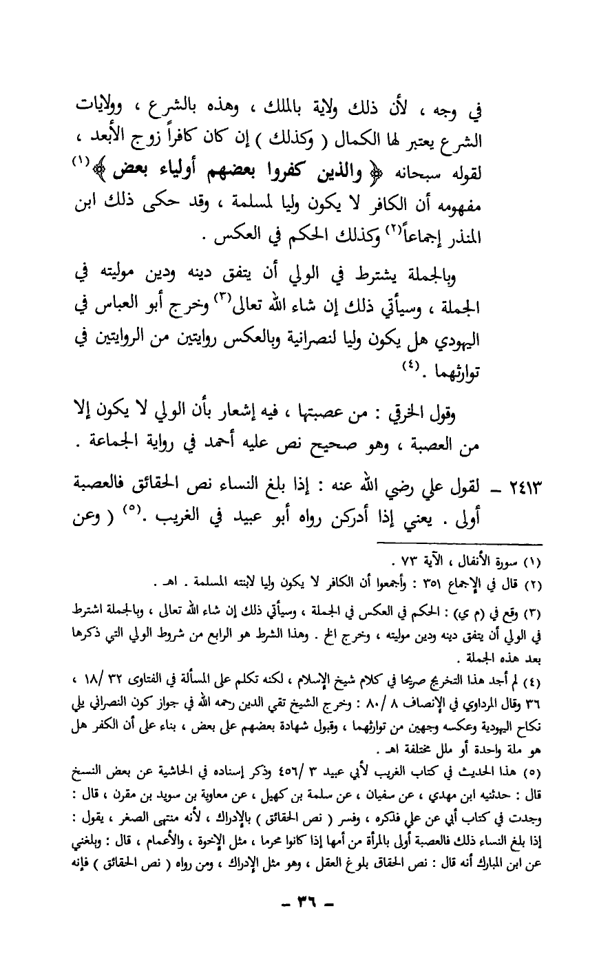2413 - لقول علي - رَضِيَ اللَّهُ عَنْهُ -: إذا بلغ النساء نص الحقائق فالعصبة أولى. يعني إذا أدركن رواه أبو عبيد في الغريب. (وعن