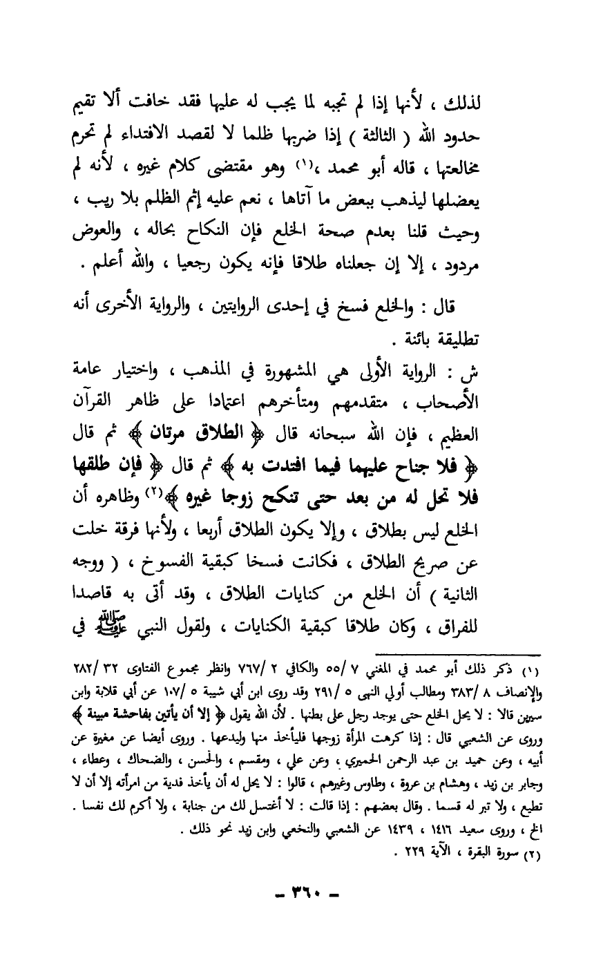 ش: الرواية الأولى هي المشهورة في المذهب، واختيار عامة الأصحاب، متقدمهم ومتأخرهم اعتمادا على ظاهر القرآن العظيم، فإن الله سبحانه قال: {الطَّلَاقُ مَرَّتَانِ} [البقرة: 229] ثم قال: {فَلَا جُنَاحَ عَلَيْهِمَا فِيمَا افْتَدَتْ بِهِ} [البقرة: 229] ثم قال: {فَإِنْ طَلَّقَهَا فَلَا تَحِلُّ لَهُ مِنْ بَعْدُ حَتَّى تَنْكِحَ زَوْجًا غَيْرَهُ} [البقرة: 230] وظاهره أن الخلع ليس بطلاق، وإلا يكون الطلاق أربعا، ولأنها فرقة خلت عن صريح الطلاق، فكانت فسخا كبقية الفسوخ، (ووجه الثانية) أن الخلع من كنايات الطلاق، وقد أتى به قاصدا للفراق، وكان طلاقا كبقية الكنايات، ولقول النبي - صَلَّى اللَّهُ عَلَيْهِ وَسَلَّمَ - في