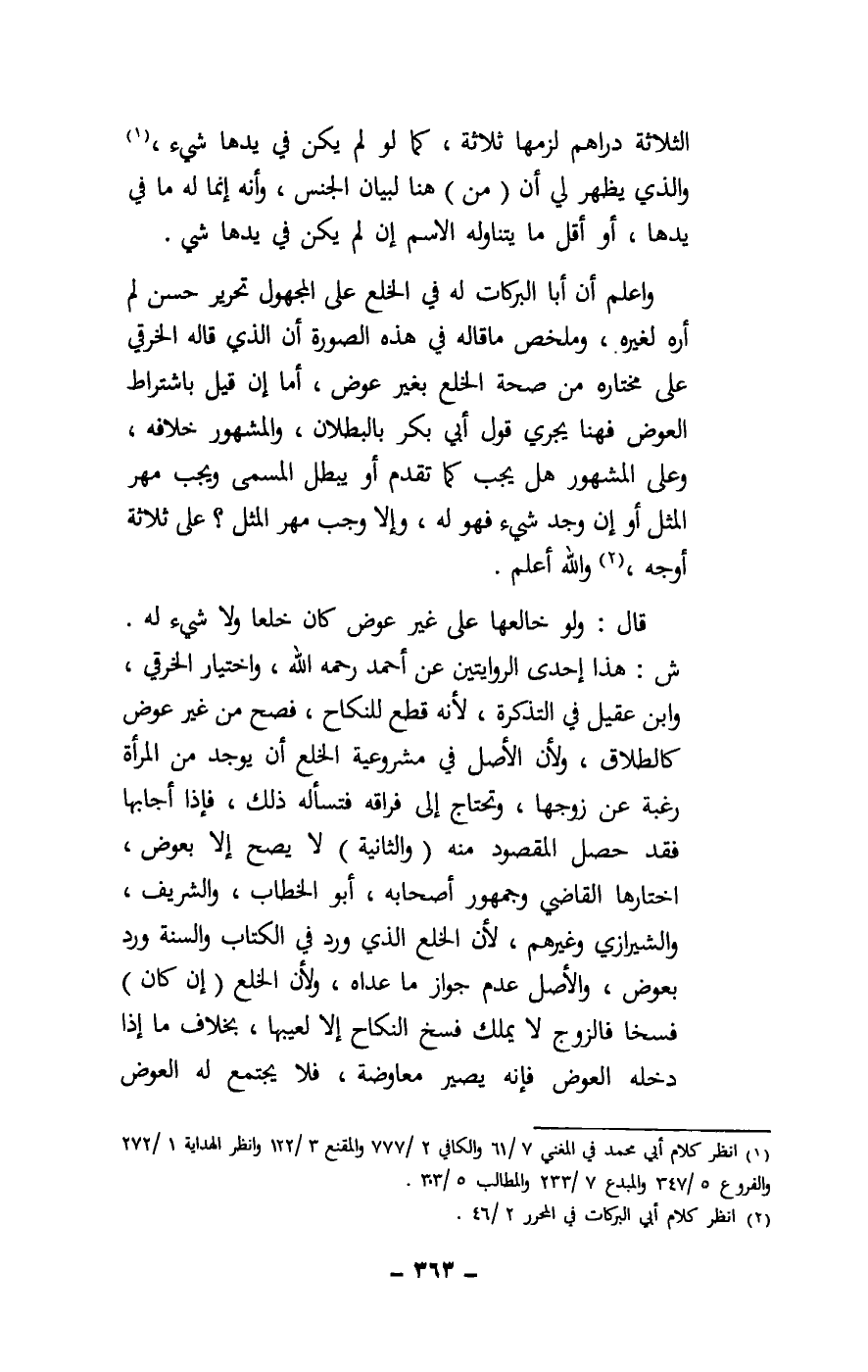واعلم أن أبا البركات له في الخلع على المجهول تحرير حسن لم أره لغيره، وملخص ما قاله في هذه الصورة أن الذي قاله الخرقي على مختاره من صحة الخلع بغير عوض، أما إن قيل باشتراط العوض فهنا يجري قول أبي بكر بالبطلان، والمشهور خلافه، وعلى المشهور هل يجب كما تقدم أو يبطل المسمى ويجب مهر المثل أو إن وجد شيء فهو له، وإلا وجب مهر المثل؟ على ثلاثة أوجه، والله أعلم.