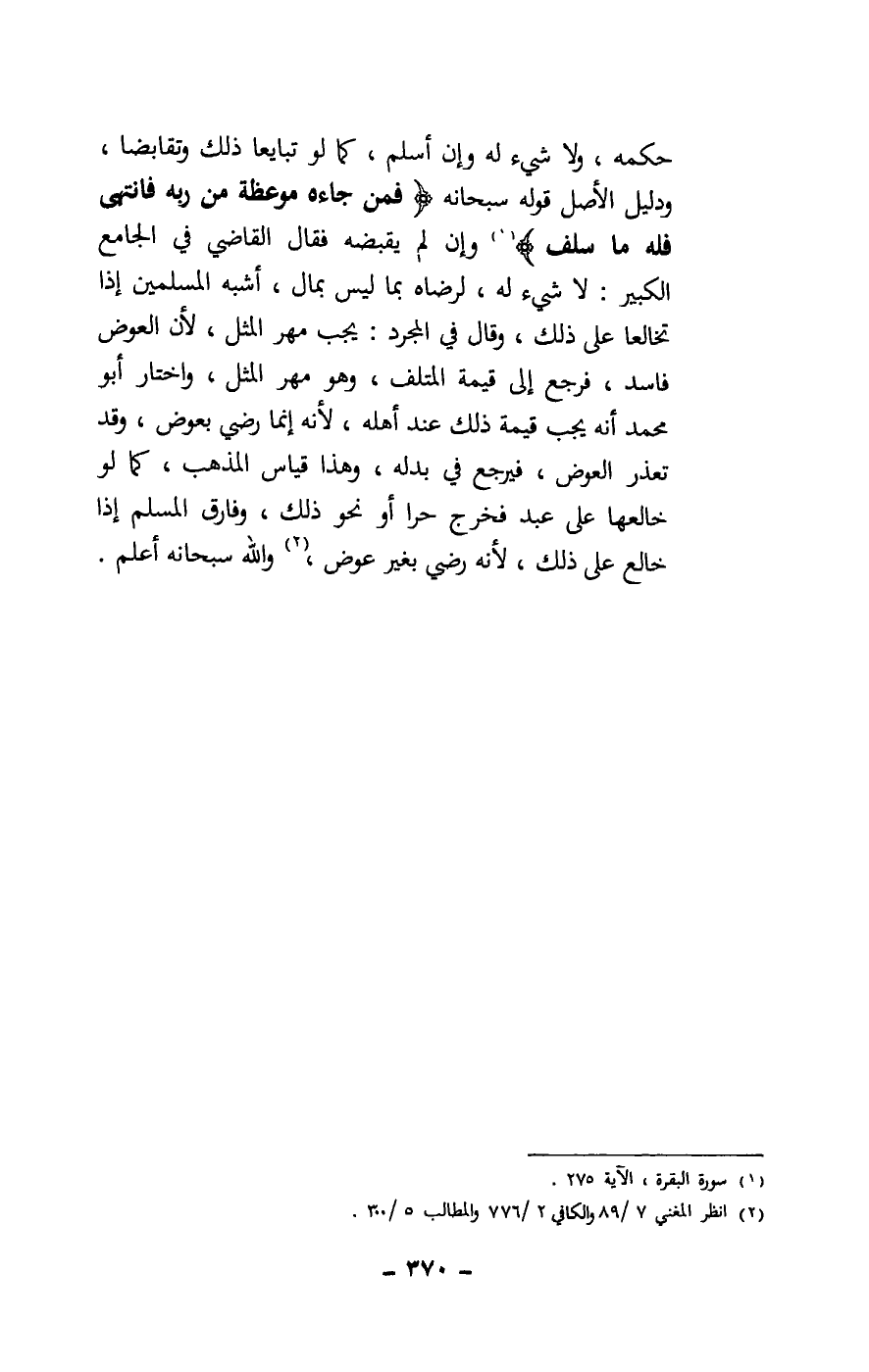 حكمه، ولا شيء له وإن أسلم، كما لو تبايعا ذلك وتقابضا، ودليل الأصل قوله سبحانه: {فَمَنْ جَاءَهُ مَوْعِظَةٌ مِنْ رَبِّهِ فَانْتَهَى فَلَهُ مَا سَلَفَ} [البقرة: 275] وإن لم يقبضه فقال القاضي في الجامع الكبير: لا شيء له، لرضاه بما ليس بمال، أشبه المسلمين إذا تخالعا على ذلك، وقال في المجرد: يجب مهر المثل، لأن العوض فاسد، فرجع إلى قيمة المتلف، وهو مهر المثل، واختار أبو محمد أنه يجب قيمة ذلك عند أهله، لأنه إنما رضي بعوض، وقد تعذر العوض، فيرجع في بدله، وهذا قياس المذهب، كما لو خالعها على عبد فخرج حرا أو نحو ذلك، وفارق المسلم إذا خالع على ذلك، لأنه رضي بغير عوض، والله سبحانه أعلم.