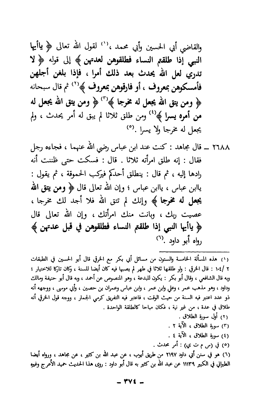 2688 - قال مجاهد: كنت عند ابن عباس - رَضِيَ اللَّهُ عَنْهُمَا -، فجاءه رجل فقال: إنه طلق امرأته ثلاثا. قال: فسكت حتى ظننت أنه رادها إليه، ثم قال: ينطلق أحدكم فيركب الحموقة، ثم يقول: يا ابن عباس، يا ابن عباس؛ وإن الله تعالى قال: {وَمَنْ يَتَّقِ اللَّهَ يَجْعَلْ لَهُ مَخْرَجًا} [الطلاق: 2] وإنك لم تتق الله فلا أجد لك مخرجا، عصيت ربك، وبانت منك امرأتك، وإن الله تعالى قال: (يا أيها النبي إذا طلقتم النساء فطلقوهن في قبل عدتهن) رواه أبو داود.