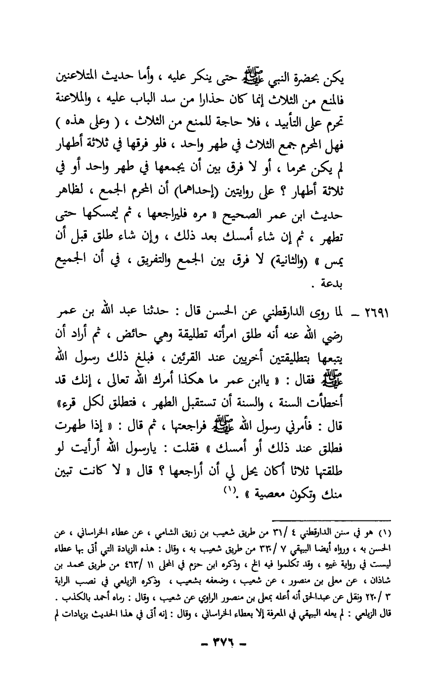 2691 - لما روى الدارقطني عن الحسن قال: «حدثنا عبد الله بن عمر - رَضِيَ اللَّهُ عَنْهُ - أنه طلق امرأته تطليقة وهي حائض، ثم أراد أن يتبعها بتطليقتين أخريين عند القرأين، فبلغ ذلك رسول الله - صَلَّى اللَّهُ عَلَيْهِ وَسَلَّمَ - فقال: «يا ابن عمر ما هكذا أمرك الله تعالى، إنك قد أخطأت السنة، والسنة أن تستقبل الطهر، فتطلق لكل قرء» قال: فأمرني رسول الله - صَلَّى اللَّهُ عَلَيْهِ وَسَلَّمَ - فراجعتها، ثم قال: «إذا طهرت فطلق عند ذلك أو أمسك» فقلت: يا رسول الله أرأيت لو طلقتها ثلاثا أكان يحل لي أن أراجعها؟ قال: «لا، كانت تبين منك وتكون معصية» .