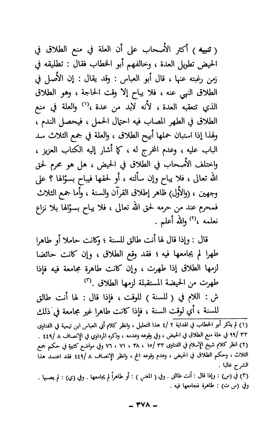 (تنبيه) : أكثر الأصحاب على أن العلة في منع الطلاق في الحيض تطويل العدة، وخالفهم أبو الخطاب فقال: تطليقه في زمن رغبته عنها، قال أبو العباس: وقد يقال: إن الأصل في الطلاق النهي عنه، فلا يباح إلا وقت الحاجة، وهو الطلاق الذي تتعقبه العدة، لأنه لا بد من عدة، والعلة في منع الطلاق في الطهر المصاب فيه احتمال الحمل، فيحصل الندم، ولهذا إذا استبان حملها أبيح الطلاق، والعلة في جمع الثلاث سد الباب عليه، وعدم المخرج له، كما أشار إليه الكتاب العزيز، واختلف الأصحاب في الطلاق في الحيض، هل هو محرم لحق الله تعالى، فلا يباح وإن سألته، أو لحقها فيباح بسؤالها؟ على وجهين، (والأول) : ظاهر إطلاق القرآن والسنة، وأما جمع الثلاث فمحرم عند من حرمه لحق الله تعالى، فلا يباح بسؤالها بلا نزاع نعلمه، والله أعلم.