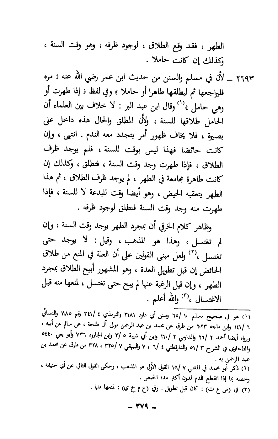2693 - لأن في مسلم والسنن من حديث ابن عمر - رَضِيَ اللَّهُ عَنْهُ -: «مره فليراجعها ثم ليطلقها طاهرا أو حاملا» ؛ وفي لفظ: «إذا طهرت أو وهي حامل» » ، وقال ابن عبد البر: لا خلاف بين العلماء أن الحامل طلاقها للسنة، ولأن المطلق والحال هذه داخل على بصيرة، فلا يخاف ظهور أمر يتجدد معه الندم. انتهى، وإن كانت حائضا فهذا ليس بوقت للسنة، فلم يوجد ظرف الطلاق، فإذا طهرت وجد وقت السنة، فتطلق، وكذلك إن كانت طاهرة مجامعة في الطهر، لم يوجد ظرف الطلاق، ثم هذا الطهر يتعقبه الحيض، وهو أيضا وقت للبدعة لا للسنة، فإذا طهرت منه وجد وقت السنة فتطلق لوجود ظرفه.