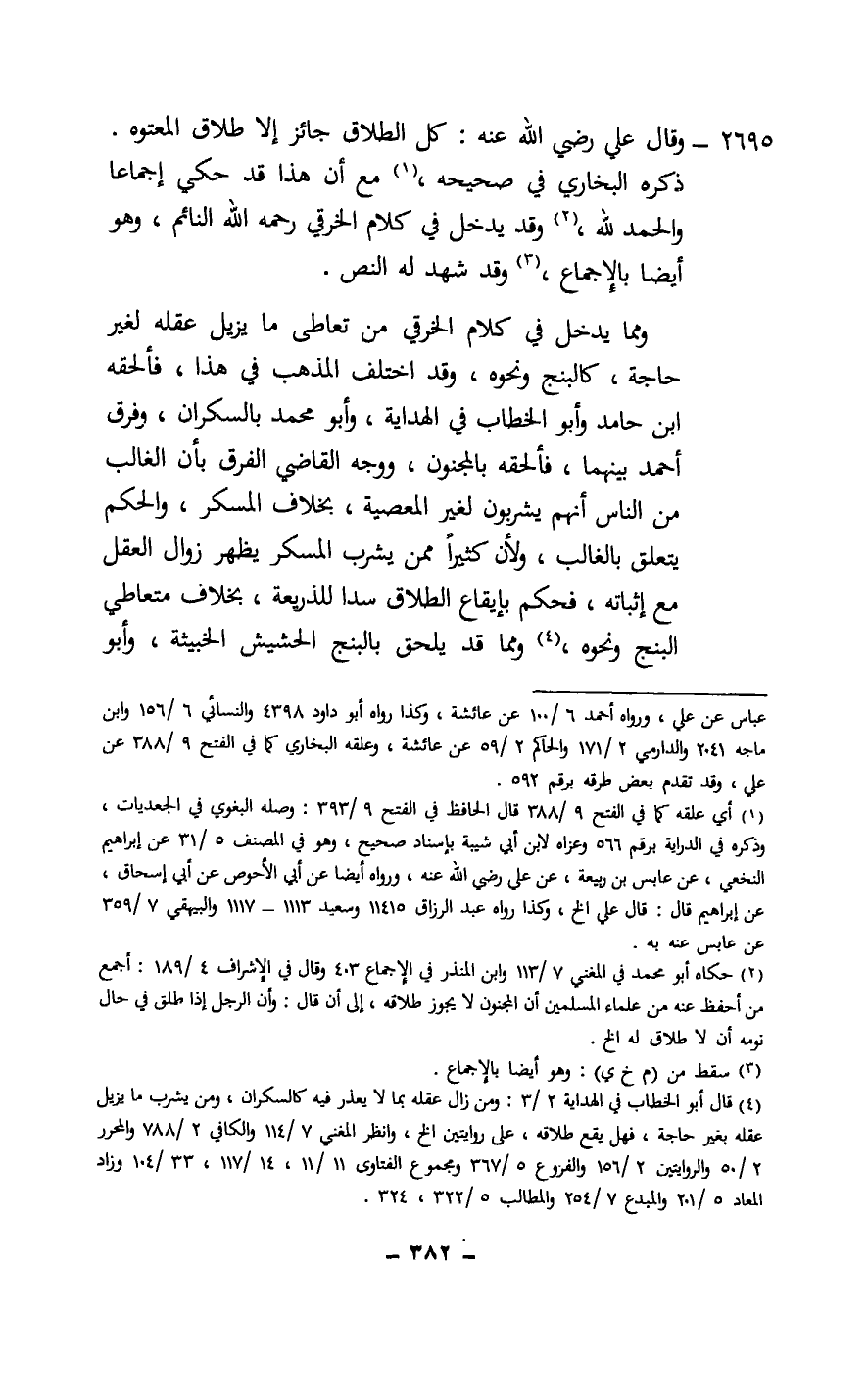 2695 - وقال علي - رَضِيَ اللَّهُ عَنْهُ -: كل الطلاق جائز إلا طلاق المعتوه. ذكره البخاري في صحيحه، مع أن هذا قد حكي إجماعا والحمد لله، وقد يدخل في كلام الخرقي - رَحِمَهُ اللَّهُ - النائم، وهو أيضا بالإجماع، وقد شهد له النص.