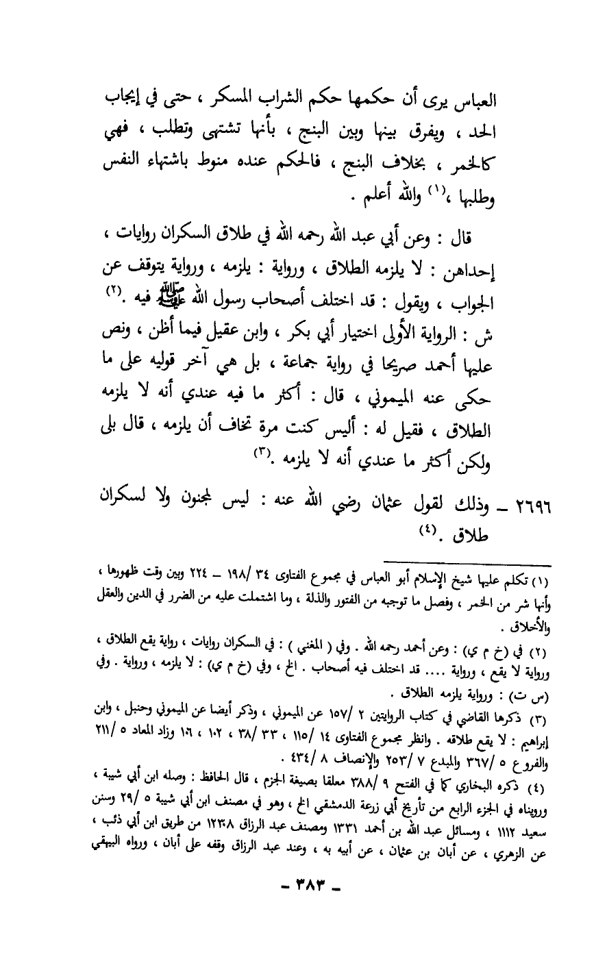 2696 - وذلك لقول عثمان - رَضِيَ اللَّهُ عَنْهُ -: ليس لمجنون ولا لسكران طلاق.