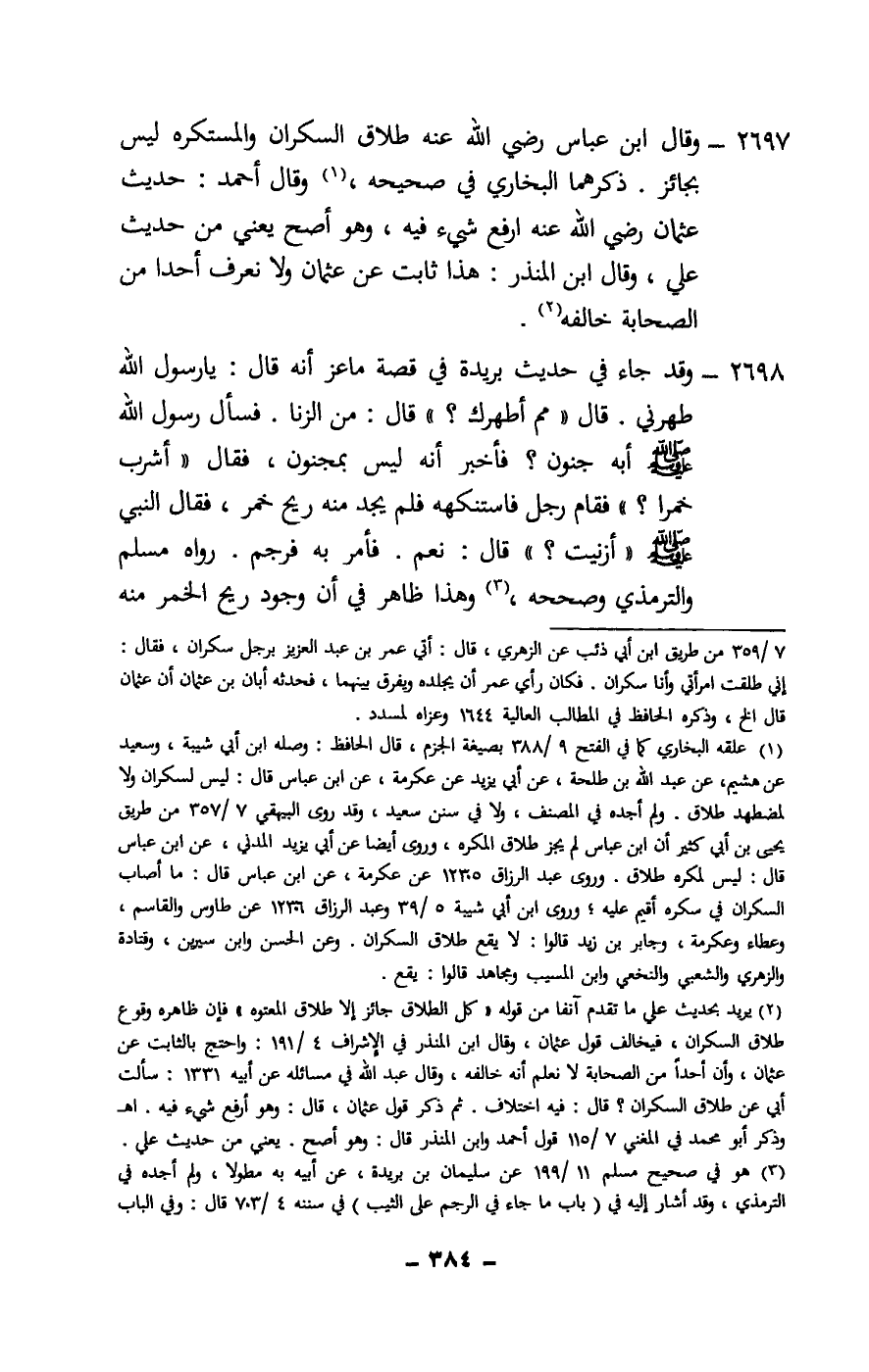 2697 - وقال ابن عباس - رَضِيَ اللَّهُ عَنْهُ - طلاق السكران والمستكره ليس بجائز. ذكرهما البخاري في صحيحه، وقال أحمد: حديث عثمان - رَضِيَ اللَّهُ عَنْهُ - أرفع شيء فيه، وهو أصح، يعني من حديث علي، وقال ابن المنذر: هذا ثابت عن عثمان ولا نعرف أحدا من الصحابة خالفه.