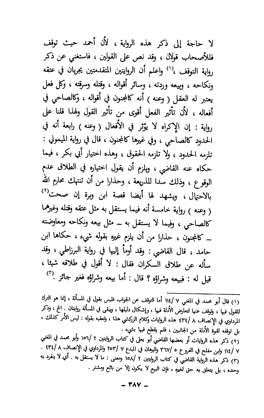 لا حاجة إلى ذكر هذه الرواية، لأن أحمد حيث توقف فللأصحاب قولان، وقد نص على القولين، فاستغني عن ذكر رواية التوقف، واعلم أن الروايتين المتقدمتين يجريان في عتقه ونكاحه، وبيعه وردته، وسائر أقواله، وقتله وسرقته، وكل فعل يعتبر له العقل (وعنه) أنه كالمجنون في أقواله، وكالصاحي في أفعاله، لأن تأثير الفعل أقوى من تأثير القول؛ ولهذا قلنا على رواية: إن الإكراه لا يؤثر في الأفعال (وعنه) رابعة أنه في الحدود كالصاحي، وفي غيرها كالمجنون، قال في رواية الميموني: تلزمه الحدود، ولا تلزمه الحقوق، وهذه اختيار أبي بكر، فيما حكاه عنه القاضي، ويلزم أن يقول اختياره في الطلاق عدم الوقوع، وذلك سدا للذريعة، وحذارا من أن تنتهك محارم الله بالاحتمال، ويشهد لها أيضا قصة ابن وبرة إن صحت، (وعنه) رواية خامسة أنه فيما يستقل به مثل عتقه وقتله وغيرهما كالصاحي، وفيما لا يستقل به - مثل بيعه ونكاحه ومعاوضته - كالمجنون، حذارا من أن يلزم غيره بقوله شيء، حكاها ابن حامد، قال القاضي: وقد أومأ إليها في رواية البرزاطي، وقد سأله عن طلاق السكران فقال: لا أقول في طلاقه شيئا، قيل له: فبيعه وشراؤه؟ قال: أما بيعه وشراؤه فغير جائز.