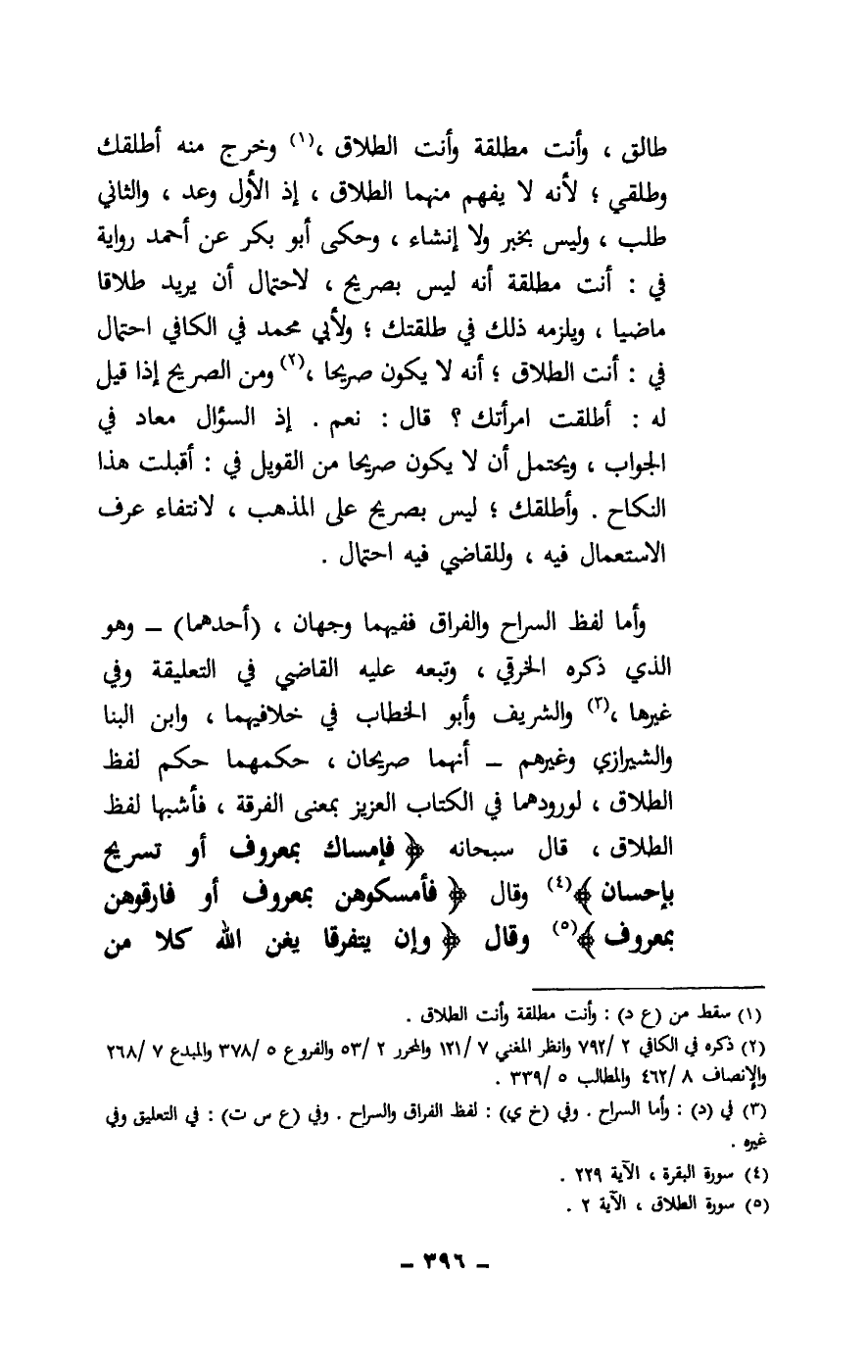 وأما لفظ السراح والفراق ففيهما وجهان، (أحدهما) - وهو الذي ذكره الخرقي، وتبعه عليه القاضي في التعليقة وفي غيرها، والشريف وأبو الخطاب في خلافيهما، وابن البنا والشيرازي وغيرهم - أنهما صريحان، حكمهما حكم لفظ الطلاق، لورودهما في الكتاب العزيز بمعنى الفرقة، فأشبها لفظ الطلاق، قال سبحانه: {فَإِمْسَاكٌ بِمَعْرُوفٍ أَوْ تَسْرِيحٌ بِإِحْسَانٍ} [البقرة: 229] وقال: {فَأَمْسِكُوهُنَّ بِمَعْرُوفٍ أَوْ فَارِقُوهُنَّ بِمَعْرُوفٍ} [الطلاق: 2] وقال: {وَإِنْ يَتَفَرَّقَا يُغْنِ اللَّهُ كُلًّا مِنْ سَعَتِهِ} [النساء: 130]