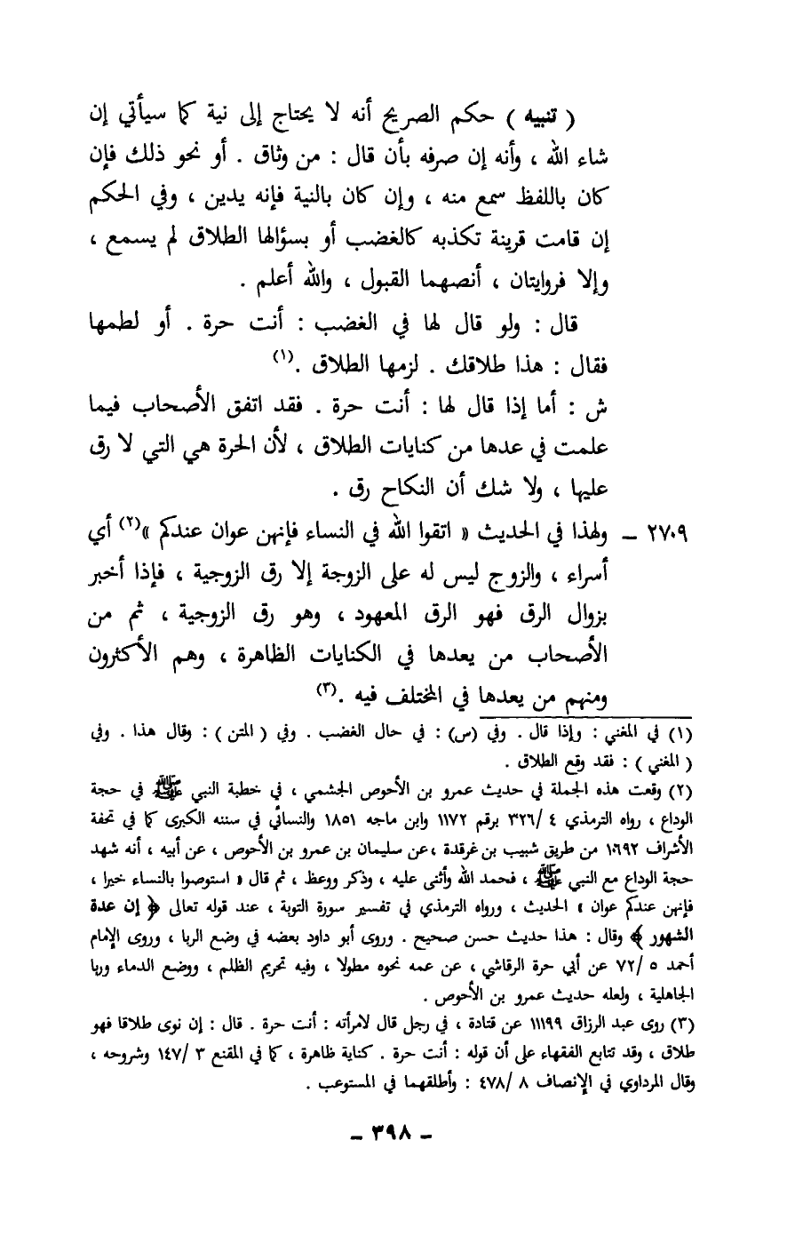 2709 - ولهذا في الحديث: «اتقوا الله في النساء فإنهن عوان عندكم» أي أسراء، والزوج ليس له على الزوجة إلا رق الزوجية، فإذا أخبر بزوال الرق فهو الرق المعهود، وهو رق الزوجية، ثم من الأصحاب من يعدها في الكنايات الظاهرة، وهم الأكثرون ومنهم من يعدها في المختلف فيه.