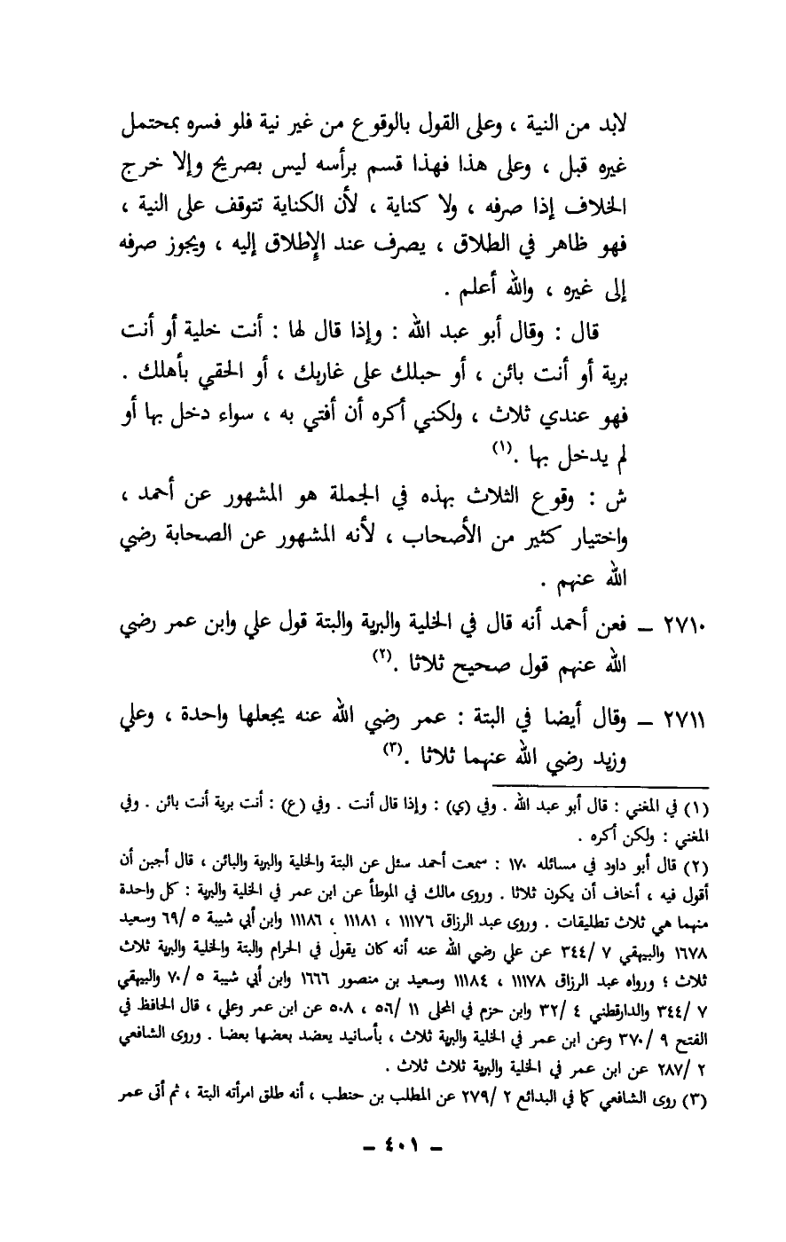 2710 - فعن أحمد أنه قال في الخلية والبرية والبتة قول علي وابن عمر - رَضِيَ اللَّهُ عَنْهُمْ - قول صحيح ثلاثا.