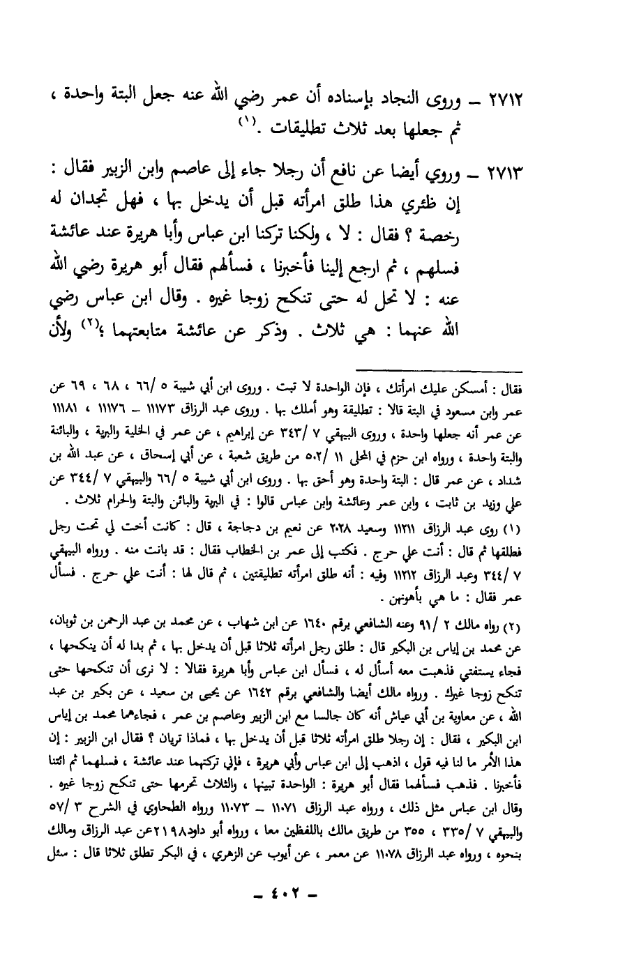 2712 - وروى النجاد بإسناده أن عمر - رَضِيَ اللَّهُ عَنْهُ - جعل البتة واحدة، ثم جعلها بعد ثلاث تطليقات.
