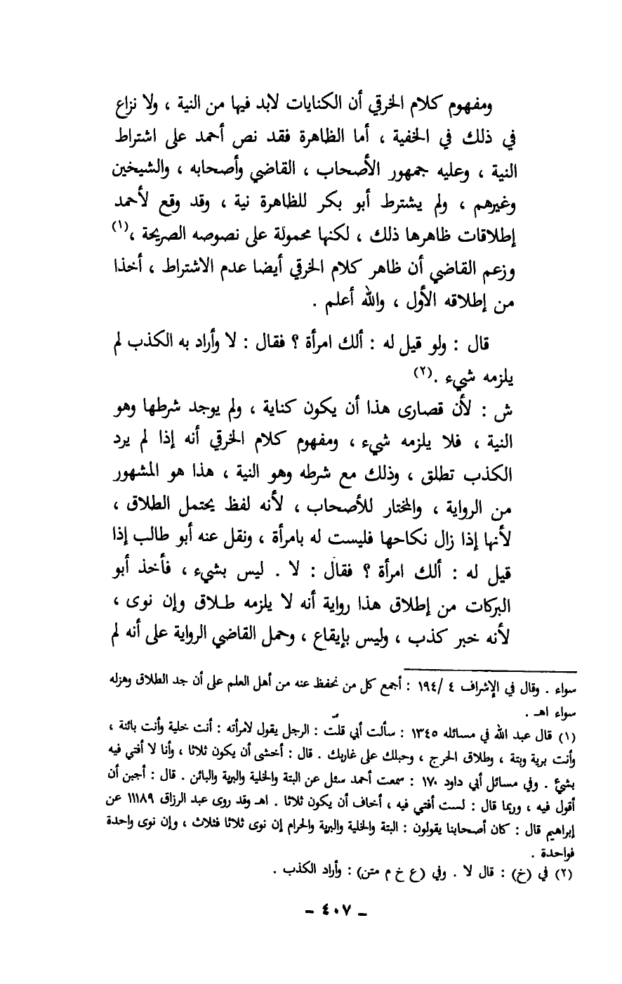 ومفهوم كلام الخرقي أن الكنايات لا بد فيها من النية، ولا نزاع في ذلك في الخفية، أما الظاهرة فقد نص أحمد على اشتراط النية، وعليه جمهور الأصحاب، القاضي وأصحابه، والشيخين وغيرهم، ولم يشترط أبو بكر للظاهرة نية، وقد وقع لأحمد إطلاقات ظاهرها ذلك، لكنها محمولة على نصوصه الصريحة، وزعم القاضي أن ظاهر كلام الخرقي أيضا عدم الاشتراط، أخذا من إطلاقه الأول، والله أعلم.