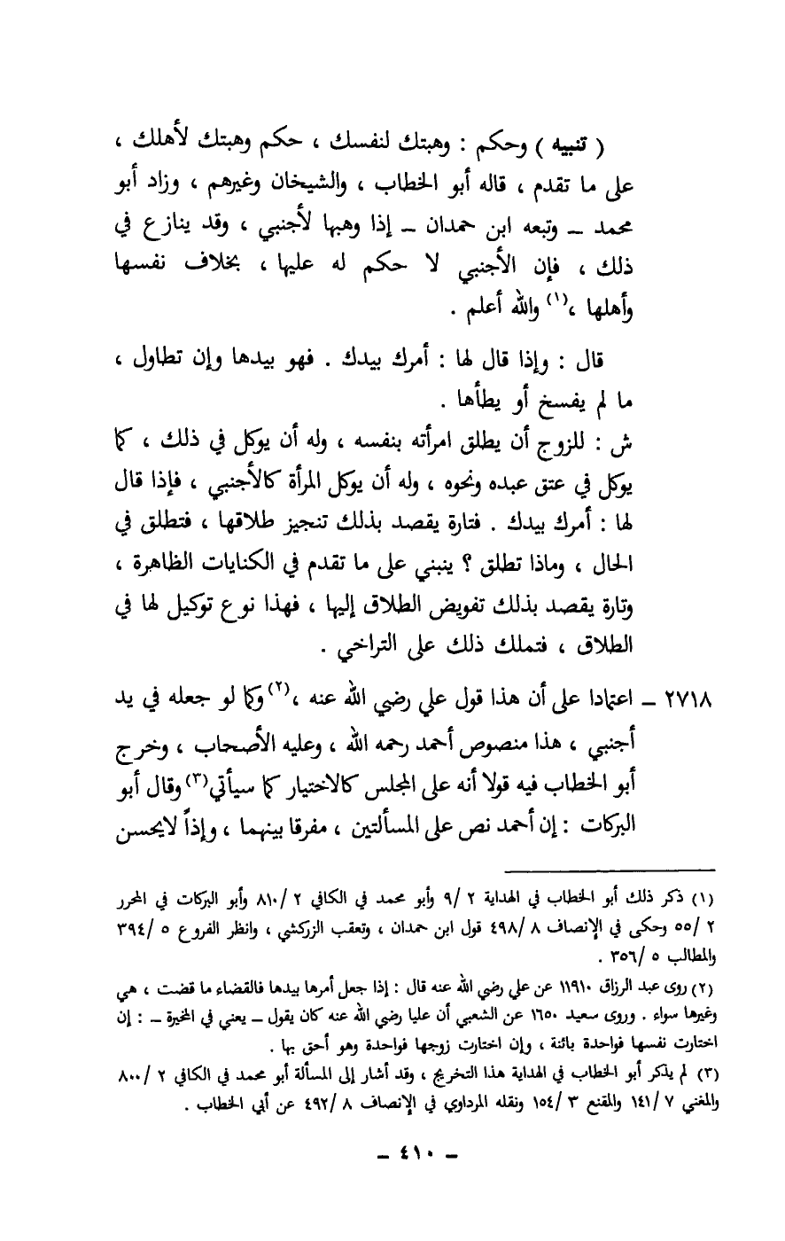 (تنبيه) : وحكم: وهبتك لنفسك، حكم وهبتك لأهلك، على ما تقدم، قاله أبو الخطاب، والشيخان وغيرهم، وزاد أبو محمد - وتبعه ابن حمدان - إذا وهبها لأجنبي، وقد ينازع في ذلك، فإن الأجنبي لا حكم له عليها، بخلاف نفسها وأهلها، والله أعلم.