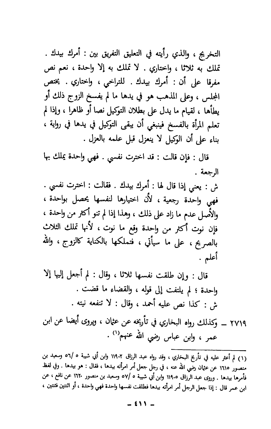 التخريج، والذي رأيته في التعليق التفريق بين: أمرك بيدك. تملك به ثلاثا، واختاري. لا تملك به إلا واحدة، نعم نص مفرقا على أن: أمرك بيدك. للتراخي، واختاري. يختص المجلس، وعلى المذهب هو في يدها ما لم يفسخ الزوج ذلك أو يطأها، لقيام ما يدل على بطلان التوكيل نصا أو ظاهرا، وإذا لم تعلم المرأة بالفسخ فينبغي أن يبقى التوكيل في يدها في رواية، بناء على أن الوكيل لا ينعزل قبل علمه بالعزل.