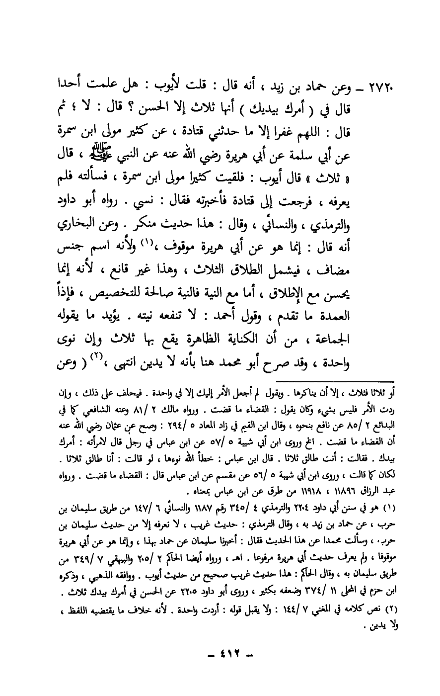 2720 - «وعن حماد بن زيد، أنه قال: قلت لأيوب: هل علمت أحدا قال في (أمرك بيديك) أنها ثلاث إلا الحسن؟ قال: لا؛ ثم قال: اللهم غفرا إلا ما حدثني قتادة، عن كثير مولى ابن سمرة عن أبي سلمة عن أبي هريرة - رَضِيَ اللَّهُ عَنْهُ - عن النبي - صَلَّى اللَّهُ عَلَيْهِ وَسَلَّمَ - قال: «ثلاث» قال أيوب: فلقيت كثيرا مولى ابن سمرة، فسألته فلم يعرفه، فرجعت إلى قتادة فأخبرته فقال: نسي» . رواه أبو داود والترمذي، والنسائي، وقال: هذا حديث منكر. وعن البخاري أنه قال: إنما هو عن أبي هريرة موقوف، ولأنه اسم جنس مضاف، فيشمل الطلاق الثلاث، وهذا غير قانع، لأنه إنما يحسن مع الإطلاق، أما مع النية فالنية صالحة للتخصيص، فإذا العمدة ما تقدم، وقول أحمد: لا تنفعه نيته. يؤيد ما يقوله الجماعة، من أن الكناية الظاهرة يقع بها ثلاث وإن نوى واحدة، وقد صرح أبو محمد هنا بأنه لا يدين انتهى، (وعن