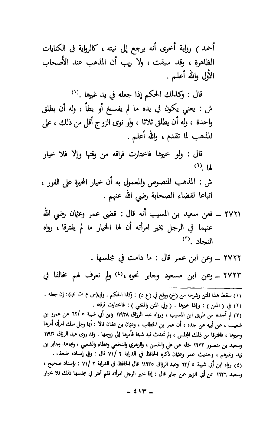 2721 - فعن سعيد بن المسيب أنه قال: قضى عمر وعثمان - رَضِيَ اللَّهُ عَنْهُمَا - في الرجل يخير امرأته أن لها الخيار ما لم يفترقا، رواه النجاد.
