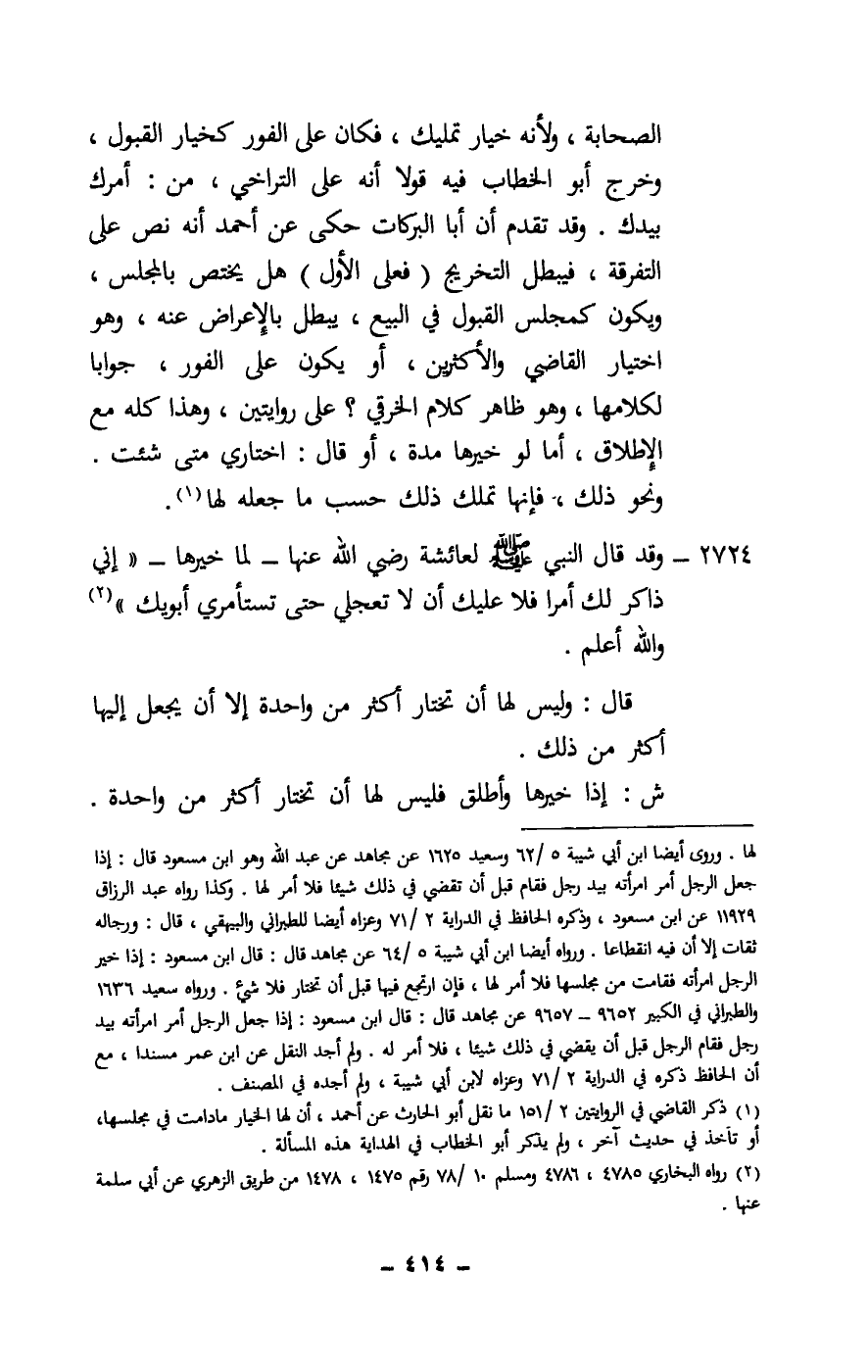 الصحابة، ولأنه خيار تمليك، فكان على الفور كخيار القبول، وخرج أبو الخطاب فيه قولا أنه على التراخي، من: أمرك بيدك. وقد تقدم أن أبا البركات حكى عن أحمد أنه نص على التفرقة، فيبطل التخريج (فعلى الأول) هل يختص بالمجلس، ويكون كمجلس القبول في البيع، يبطل بالإعراض عنه، وهو اختيار القاضي والأكثرين، أو يكون على الفور، جوابا لكلامها، وهو ظاهر كلام الخرقي؟ على روايتين، وهذا كله مع الإطلاق، أما لو خيرها مدة، أو قال: اختاري متى شئت. ونحو ذلك، فإنها تملك ذلك حسب ما جعله لها.