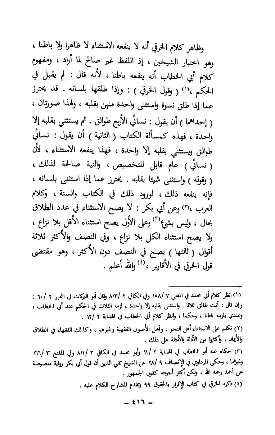 وظاهر كلام الخرقي أنه لا ينفعه الاستثناء لا ظاهرا ولا باطنا، وهو اختيار الشيخين، إذ اللفظ غير صالح لما أراد، ومفهوم كلام أبي الخطاب أنه ينفعه باطنا، لأنه قال: لم يقبل في الحكم، (وقول الخرقي) : وإذا طلقها بلسانه. قد يحترز عما إذا طلق نسوة واستثنى واحدة منهن بقلبه، ولهذا صورتان، (إحداهما) : أن يقول: نسائي الأربع طوالق. ثم يستثنى بقلبه إلا واحدة، فهذه كمسألة الكتاب (الثانية) : أن يقول: نسائي طوالق ويستثني بقلبه إلا واحدة، فهذا ينفعه الاستثناء، لأن (نسائي) عام قابل للتخصيص، والنية صالحة لذلك، (وقوله) : واستثنى شيئا بقلبه. يحترز عما إذا استثنى بلسانه، فإنه ينفعه ذلك، لورود ذلك في الكتاب والسنة، وكلام العرب، وعن أبي بكر: لا يصح الاستثناء في عدد الطلاق بحال، وليس بشيء، وعلى الأول يصح استثناء الأقل بلا نزاع، ولا يصح استثناء الكل بلا نزاع، وفي النصف والأكثر ثلاثة أقوال (ثالثها) : يصح في النصف دون الأكثر، وهو مقتضى قول الخرقي في الأقارير، والله أعلم.