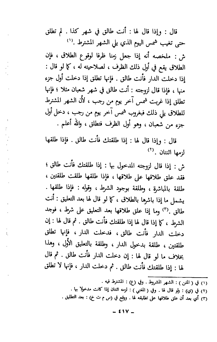 ش: ملخصة أنه إذا جعل زمنا طرفا لوقوع الطلاق، فإن الطلاق يقع في أول ذلك الظرف، لصلاحيته له، كما لو قال: إذا دخلت الدار فأنت طالق. فإنها تطلق إذا دخلت أول جزء منها، فإذا قال لزوجته: أنت طالق في شهر شعبان مثلا؛ فإنها تطلق إذا غربت شمس آخر يوم من رجب، لأن الشهر المشترط للطلاق يلي ذلك فبغروب شمس آخر يوم من رجب، دخل أول جزء من شعبان، وهو أول الظرف فتطلق، والله أعلم.