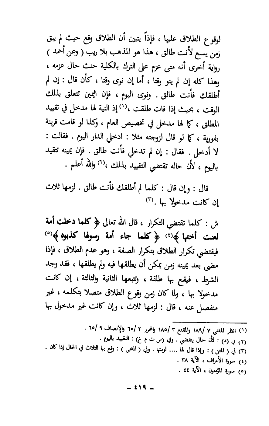 ش: كلما تقتضي التكرار، قال الله تعالى: {كُلَّمَا دَخَلَتْ أُمَّةٌ لَعَنَتْ أُخْتَهَا} [الأعراف: 38] {مَا جَاءَ أُمَّةً رَسُولُهَا كَذَّبُوهُ} [المؤمنون: 44] فيقتضي تكرار الطلاق بتكرار الصفة، وهو عدم الطلاق، فإذا مضى بعد يمينه زمن يمكن أن يطلقها فيه ولم يطلقها، فقد وجد الشرط، فيقع بها طلقة، وتتبعها الثانية والثالثة، إن كانت مدخولا بها، ولما كان زمن وقوع الطلاق متصلا بتكلمه، غير منفصل عنه، قال: لزمها ثلاث، وإن كانت غير مدخول بها