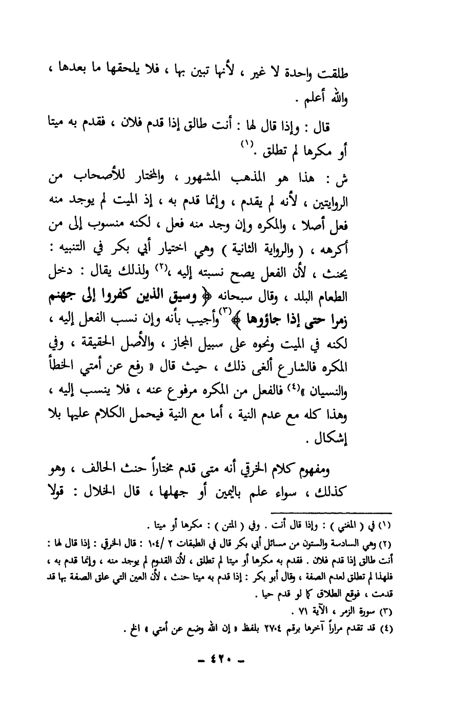ش: هذا هو المذهب المشهور، والمختار للأصحاب من الروايتين، لأنه لم يقدم، وإنما قدم به، إذ الميت لم يوجد منه فعل أصلا، والمكره وإن وجد منه فعل، لكنه منسوب إلى من أكرهه، (والرواية الثانية) وهي اختيار أبي بكر في التنبيه: يحنث، لأن الفعل يصح نسبته إليه، ولذلك يقال: دخل الطعام البلد، وقال سبحانه: {وَسِيقَ الَّذِينَ كَفَرُوا إِلَى جَهَنَّمَ زُمَرًا حَتَّى إِذَا جَاءُوهَا} [الزمر: 71] وأجيب بأنه وإن نسب الفعل إليه، لكنه في الميت ونحوه على سبيل المجاز، والأصل الحقيقة، وفي المكره فالشارع ألغى ذلك، حيث قال: «رفع عن أمتي الخطأ والنسيان» فالفعل من المكره مرفوع عنه، فلا ينسب إليه، وهذا كله مع عدم النية، أما مع النية فيحمل الكلام عليها بلا إشكال.