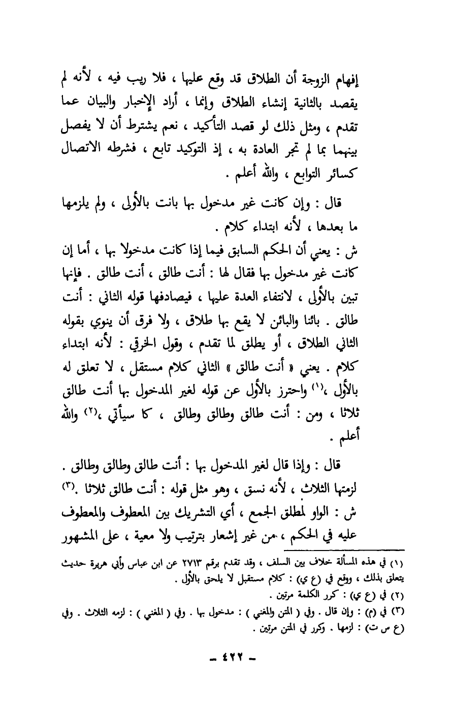ش: يعني أن الحكم السابق فيما إذا كانت مدخولا بها، أما إن كانت غير مدخول بها فقال لها: أنت طالق، أنت طالق. فإنها تبين بالأولى، لانتفاء العدة عليها، فيصادفها قوله الثاني: أنت طالق. بائنا والبائن لا يقع بها طلاق، ولا فرق أن ينوي بقوله الثاني الطلاق، أو يطلق لما تقدم، وقول الخرقي: لأنه ابتداء كلام. يعني «أنت طالق» الثاني كلام مستقل، لا تعلق له بالأول، واحترز بالأول عن قوله لغير المدخول بها أنت طالق ثلاثا، ومن: أنت طالق وطالق وطالق، كما سيأتي، والله أعلم.
