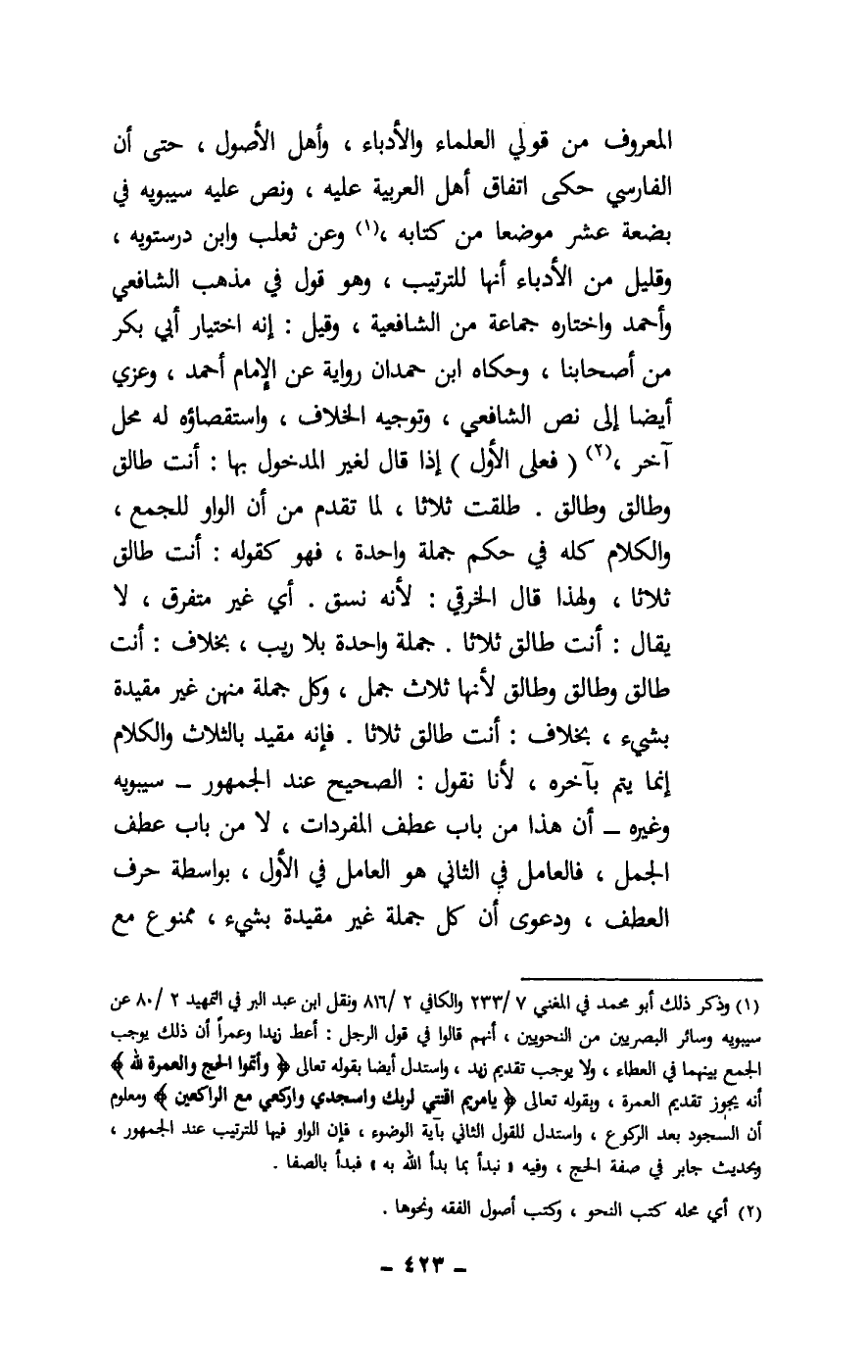 المعروف من قولي العلماء والأدباء، وأهل الأصول، حتى أن الفارسي حكى اتفاق أهل العربية عليه، ونص عليه سيبويه في بضعة عشر موضعا من كتابه، وعن ثعلب وابن درستويه، وقليل من الأدباء أنها للترتيب، وهو قول في مذهب الشافعي وأحمد واختاره جماعة من الشافعية، وقيل: إنه اختيار أبي بكر من أصحابنا، وحكاه ابن حمدان رواية عن الإمام أحمد وعزي أيضا إلى نص الشافعي، وتوجيه الخلاف، واستقصاؤه له محل آخر، (فعلى الأول) إذا قال لغير المدخول بها: أنت طالق وطالق وطالق. طلقت ثلاثا، لما تقدم من أن الواو للجمع، والكلام كله في حكم جملة واحدة، فهو كقوله: أنت طالق ثلاثا، ولهذا قال الخرقي: لأنه نسق. أي غير متفرق، لا يقال: أنت طالق ثلاثا. جملة واحدة بلا ريب، بخلاف: أنت طالق وطالق وطالق لأنها ثلاث جمل، وكل جملة منهن غير مقيدة بشيء، بخلاف: أنت طالق ثلاثا. فإنه مقيد بالثلاث والكلام إنما يتم بآخره، لأنا نقول: الصحيح عند الجمهور - سيبويه وغيره - أن هذا من باب عطف المفردات، لا من باب عطف الجمل، فالعامل في الثاني هو العامل في الأول، بواسطة حرف العطف، ودعوى أن كل جملة غير مقيدة بشيء، ممنوع مع