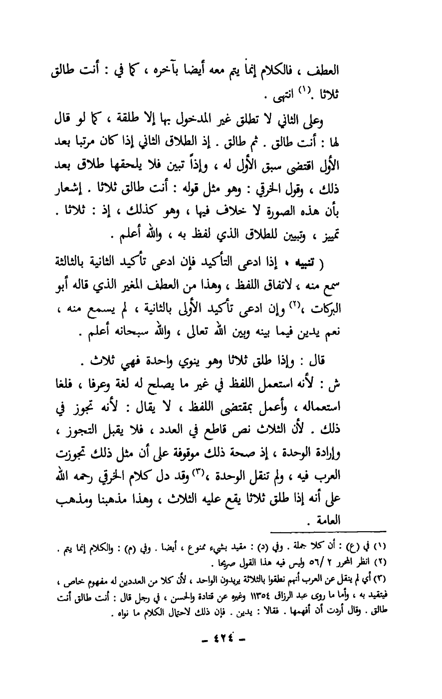 العطف، فالكلام إنما يتم معه أيضا بآخره، كما في: أنت طالق ثلاثا. انتهى.