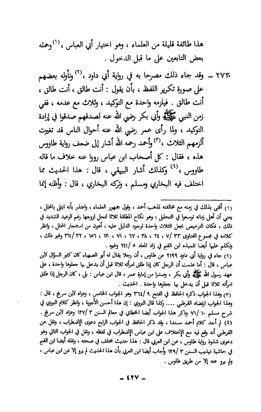 2730 - وقد جاء ذلك مصرحا به في رواية أبي داود، وتأوله بعضهم على صورة تكرير اللفظ، بأن يقول: أنت طالق، أنت طالق، أنت طالق. فيلزمه واحدة مع التوكيد، وثلاث مع عدمه، ففي زمن النبي - صَلَّى اللَّهُ عَلَيْهِ وَسَلَّمَ - وأبي بكر - رَضِيَ اللَّهُ عَنْهُ - لصدقهم صدقوا في إرادة التوكيد، ولما رأى عمر - رَضِيَ اللَّهُ عَنْهُ - أحوال الناس قد تغيرت ألزمهم الثلاث، وأحمد - رَحِمَهُ اللَّهُ - أشار إلى ضعف رواية طاووس هذه، فقال: كل أصحاب ابن عباس رووا عنه خلاف ما قاله طاووس، وكذلك أشار البيهقي، قال: هذا الحديث مما اختلف فيه البخاري ومسلم، وتركه البخاري، قال: وأظنه إنما