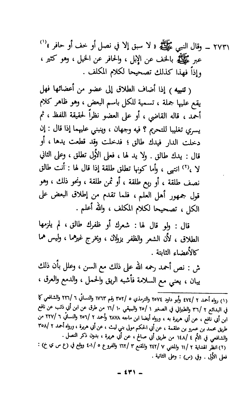 2731 - وقال النبي - صَلَّى اللَّهُ عَلَيْهِ وَسَلَّمَ -: «لا سبق إلا في نصل أو خف أو حافر» عبر - صَلَّى اللَّهُ عَلَيْهِ وَسَلَّمَ - بالخف عن الإبل، والحافر عن الخيل، وهو كثير، وإذا فهذا كذلك تصحيحا لكلام المكلف.