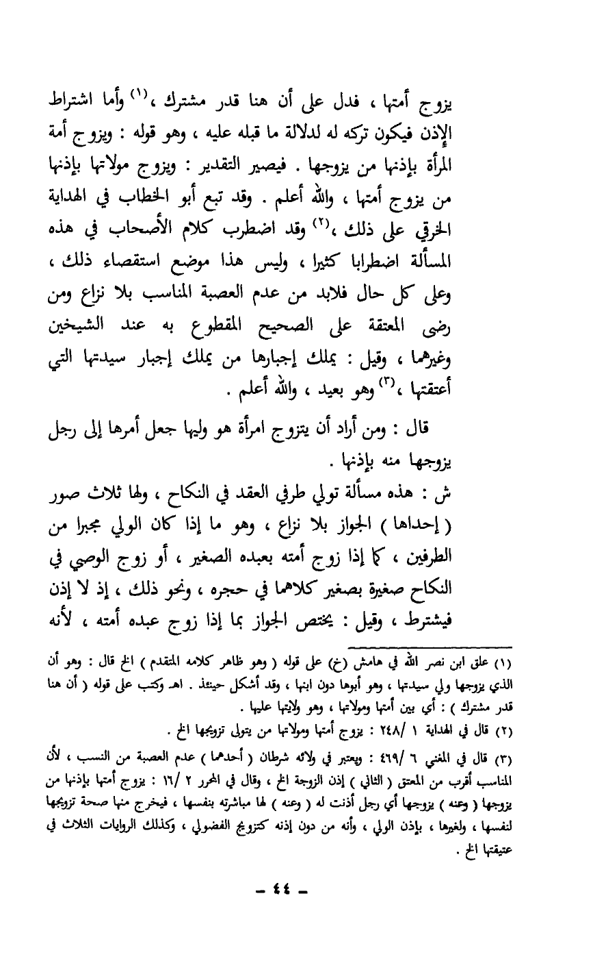 وقد تبع أبو الخطاب في الهداية الخرقي على ذلك، وقد اضطرب كلام الأصحاب في هذه المسألة اضطرابا كثيرا، وليس هذا موضع استقصاء ذلك، وعلى كل حال فلا بد من عدم العصبة المناسب بلا نزاع ومن رضى المعتقة على الصحيح المقطوع به عند الشيخين وغيرهما، وقيل: يملك إجبارها من يملك إجبار سيدتها التي أعتقتها، وهو بعيد، والله أعلم.