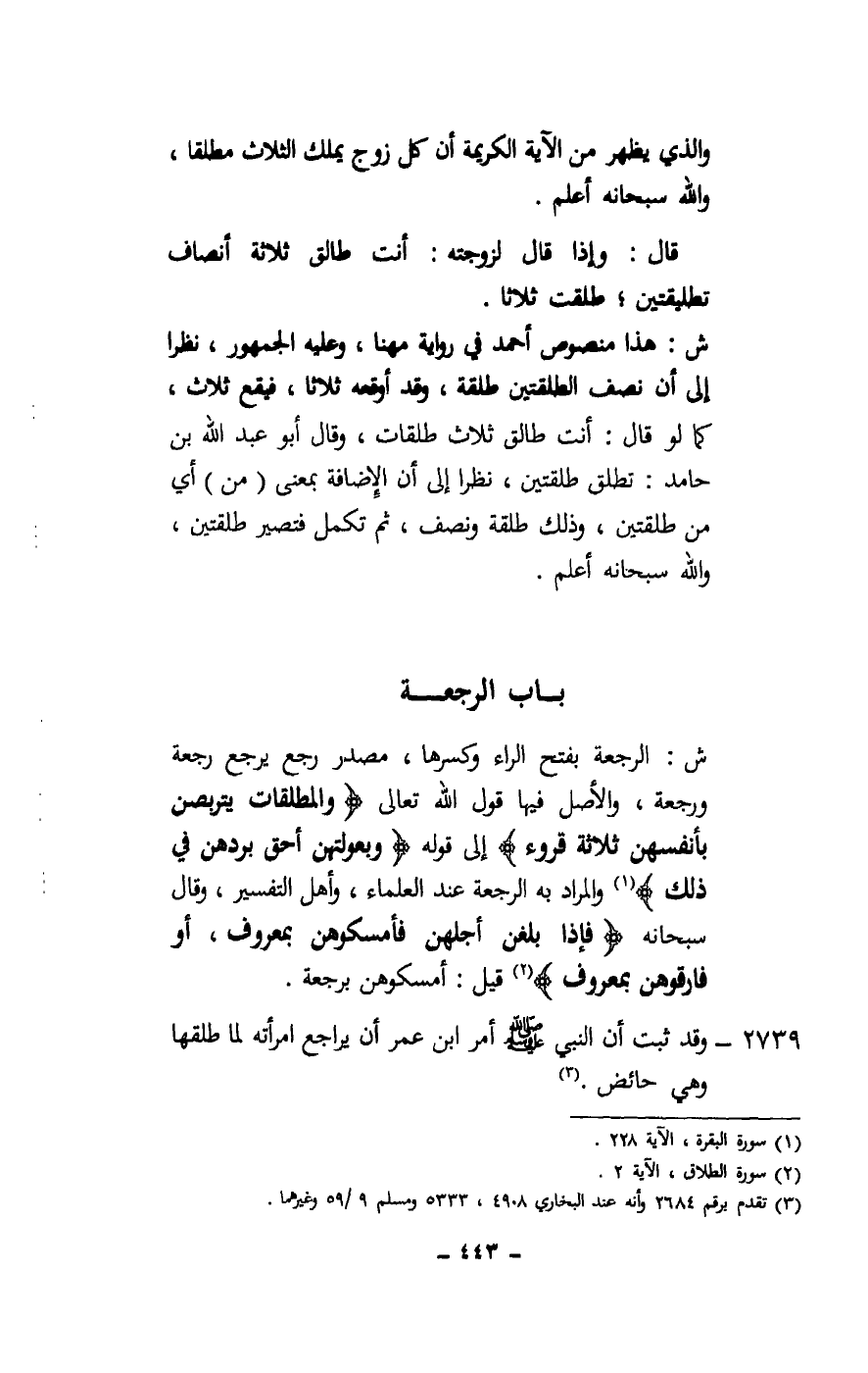ش: الرجعة بفتح الراء وكسرها، مصدر رجع يرجع رجعة ورجعة، والأصل فيها قول الله تعالى: {وَالْمُطَلَّقَاتُ يَتَرَبَّصْنَ بِأَنْفُسِهِنَّ ثَلَاثَةَ قُرُوءٍ} [البقرة: 228] إلى قوله: {وَبُعُولَتُهُنَّ أَحَقُّ بِرَدِّهِنَّ فِي ذَلِكَ} [البقرة: 228] والمراد به الرجعة عند العلماء، وأهل التفسير، وقال سبحانه: {فَإِذَا بَلَغْنَ أَجَلَهُنَّ فَأَمْسِكُوهُنَّ بِمَعْرُوفٍ أَوْ فَارِقُوهُنَّ بِمَعْرُوفٍ} [الطلاق: 2] قيل: أمسكوهن برجعة.