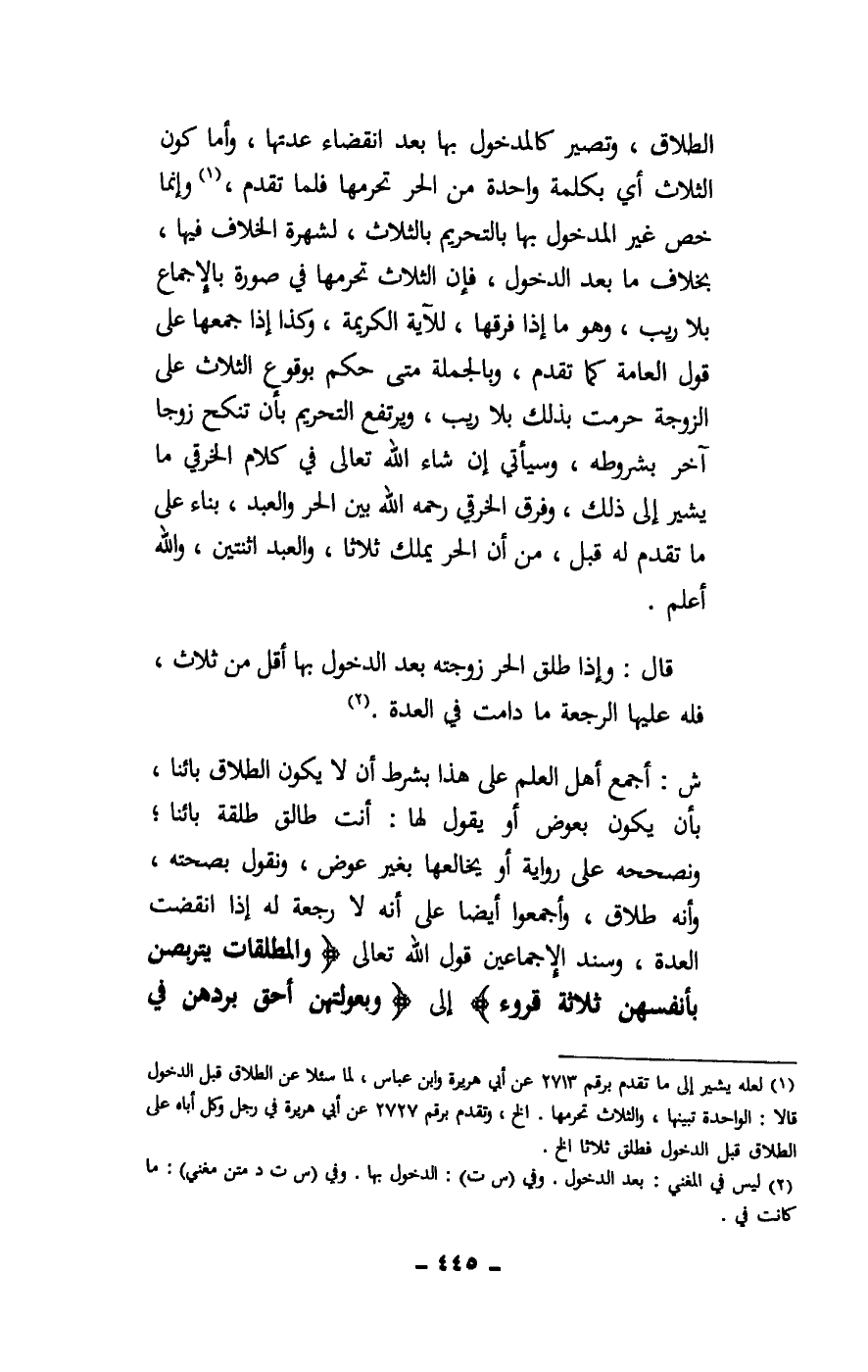 ش: أجمع أهل العلم على هذا بشرط أن لا يكون الطلاق بائنا، بأن يكون بعوض أو يقول لها: أنت طالق طلقة بائنا؛ ونصححه على رواية أو يخالعها بغير عوض، ونقول بصحته، وأنه طلاق، وأجمعوا أيضا على أنه لا رجعة له إذا انقضت العدة، وسند الإجماعين قول الله تعالى: {وَالْمُطَلَّقَاتُ يَتَرَبَّصْنَ بِأَنْفُسِهِنَّ ثَلَاثَةَ قُرُوءٍ} [البقرة: 228] إلى: {وَبُعُولَتُهُنَّ أَحَقُّ بِرَدِّهِنَّ فِي ذَلِكَ} [البقرة: 228]