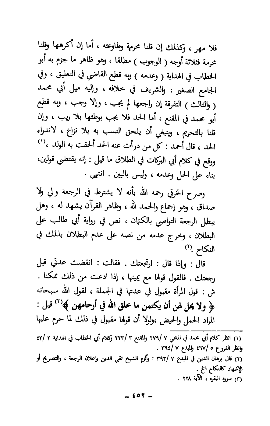 فلا مهر، وكذلك إن قلنا محرمة وطاوعته، أما إن أكرهها وقلنا محرمة فثلاثة أوجه (الوجوب) مطلقا، وهو ظاهر ما جزم به أبو الخطاب في الهداية (وعدمه) وبه قطع القاضي في التعليق، وفي الجامع الصغير، والشريف في خلافه، وإليه ميل أبي محمد (والثالث) التفرقة إن راجعها لم يجب، وإلا وجب، وبه قطع أبو محمد في المقنع، أما الحد فلا يجب بوطئها بلا ريب، وإن قلنا بالتحريم، وينبغي أن يلحق النسب به بلا نزاع، لاندراء الحد، قال أحمد: كل من درأت عنه الحد ألحقت به الولد، ووقع في كلام أبي البركات في الطلاق ما قيل: إنه يقتضي قولين، بناء على الحل وعدمه، وليس بالبين. انتهى.