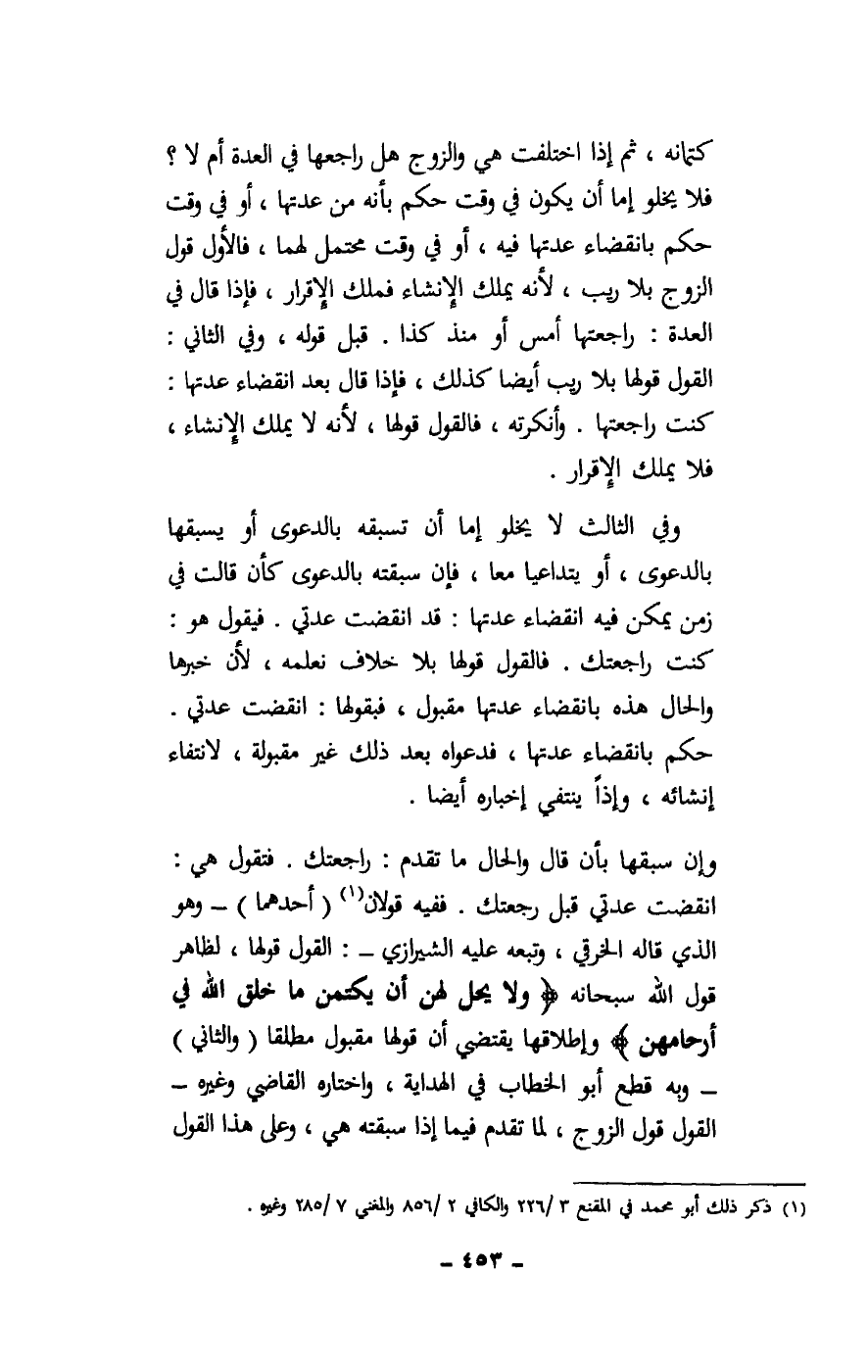 وإن سبقها بأن قال والحال ما تقدم: راجعتك. فتقول هي: انقضت عدتي قبل رجعتك. ففيه قولان (أحدهما) - وهو الذي قاله الخرقي، وتبعه عليه الشيرازي -: القول قولها، لظاهر قول الله سبحانه: {وَلَا يَحِلُّ لَهُنَّ أَنْ يَكْتُمْنَ مَا خَلَقَ اللَّهُ فِي أَرْحَامِهِنَّ} [البقرة: 228] وإطلاقها يقتضي أن قولها مقبول مطلقا (والثاني) - وبه قطع أبو الخطاب في الهداية، واختاره القاضي وغيره - القول قول الزوج، لما تقدم فيما إذا سبقته هي، وعلى هذا القول