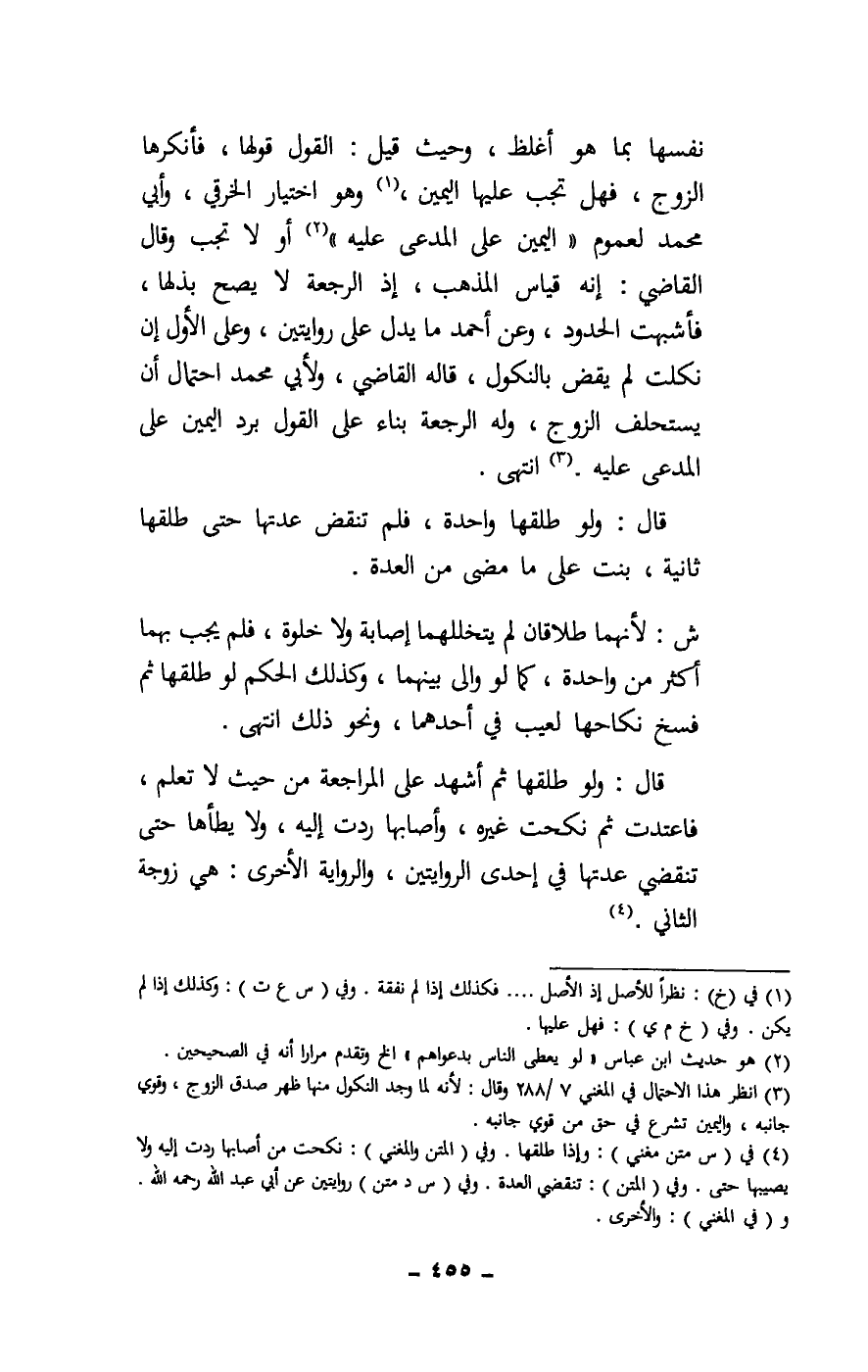نفسها بما هو أغلظ، وحيث قيل: القول قولها، فأنكرها الزوج، فهل تجب عليها اليمين، وهو اختيار الخرقي، وأبي محمد لعموم «اليمين على المدعى عليه» أو لا تجب وقال القاضي: إنه قياس المذهب، إذ الرجعة لا يصح بذلها، فأشبهت الحدود، وعن أحمد ما يدل على روايتين، وعلى الأول إن نكلت لم يقض بالنكول، قاله القاضي، ولأبي محمد احتمال أن يستحلف الزوج، وله الرجعة بناء على القول برد اليمين على المدعى عليه. انتهى.