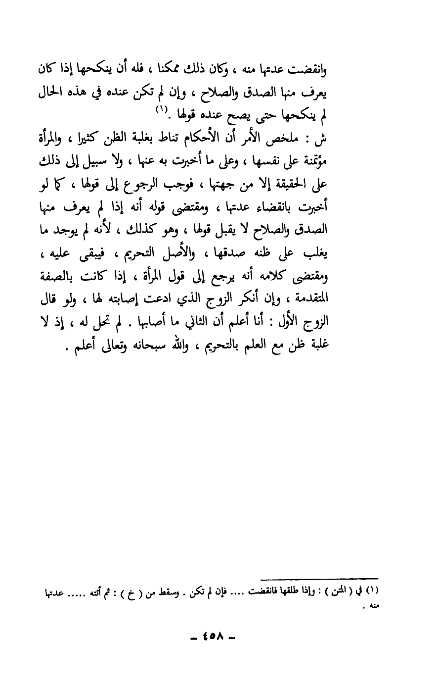 ش: ملخص الأمر أن الأحكام تناط بغلبة الظن كثيرا، والمرأة مؤتمنة على نفسها، وعلى ما أخبرت به عنها، ولا سبيل إلى ذلك على الحقيقة إلا من جهتها، فوجب الرجوع إلى قولها، كما لو أخبرت بانقضاء عدتها، ومقتضى قوله أنه إذا لم يعرف منها الصدق والصلاح لا يقبل قولها، وهو كذلك، لأنه لم يوجد ما يغلب على ظنه صدقها، والأصل التحريم، فيبقى عليه، ومقتضى كلامه أنه يرجع إلى قول المرأة، إذا كانت بالصفة المتقدمة، وإن أنكر الزوج الذي ادعت إصابته لها، ولو قال الزوج الأول: أنا أعلم أن الثاني ما أصابها. لم تحل له، إذ لا غلبة ظن مع العلم بالتحريم، والله سبحانه وتعالى أعلم.