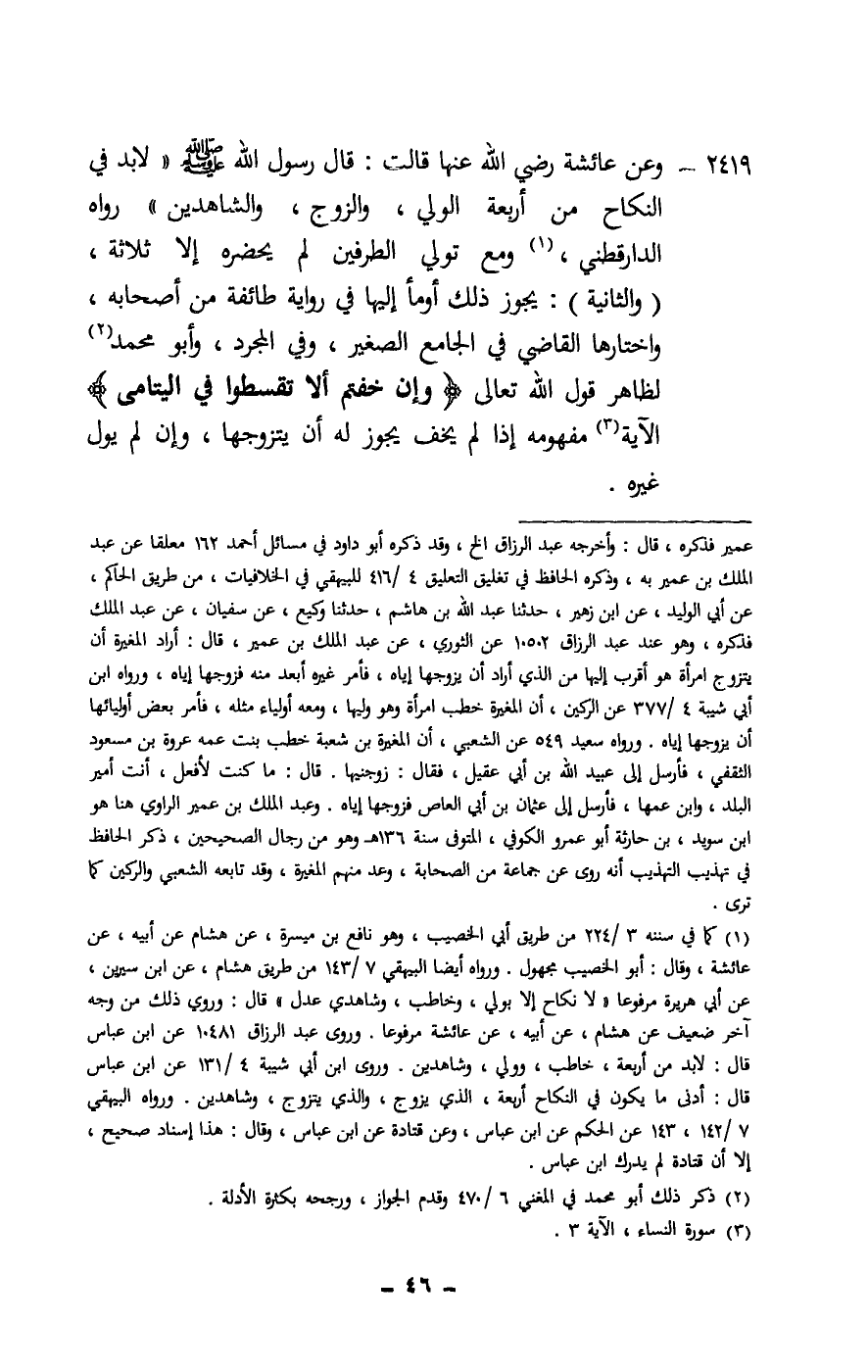 2419 - وعن عائشة - رَضِيَ اللَّهُ عَنْهَا - قالت: قال رسول الله - صَلَّى اللَّهُ عَلَيْهِ وَسَلَّمَ -: «لا بد في النكاح من أربعة: الولي، والزوج، والشاهدين» رواه الدارقطني، ومع تولي الطرفين لم يحضره إلا ثلاثة، (والثانية) : يجوز ذلك أومأ إليها في رواية طائفة من أصحابه، واختارها القاضي في الجامع الصغير، وفي المجرد، وأبو محمد لظاهر قول الله تعالى: {وَإِنْ خِفْتُمْ أَلَّا تُقْسِطُوا فِي الْيَتَامَى} [النساء: 3] الآية، مفهومه إذا لم يخف يجوز له أن يتزوجها، وإن لم يول غيره.