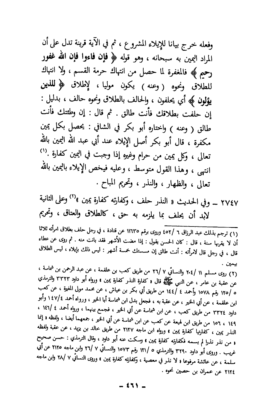 2747 - وفي الحديث: «النذر حلف، وكفارته كفارة يمين» وعلى الثانية لا بد أن يحلف بما يلزمه به حق، كالطلاق والعتاق، وتحريم