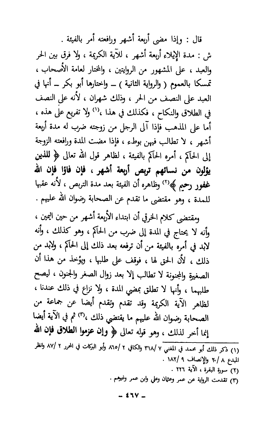 ش: مدة الإيلاء أربعة أشهر، للآية الكريمة، ولا فرق بين الحر والعبد، على المشهور من الروايتين، والمختار لعامة الأصحاب، تمسكا بالعموم (والرواية الثانية) - واختارها أبو بكر - أنها في العبد على النصف من الحر، وذلك شهران، لأنه على النصف في الطلاق والنكاح، فكذلك في هذا، ولا تفريع على هذه، أما على المذهب فإذا آلى الرجل من زوجته ضرب له مدة أربعة أشهر، لا تطالب فيهن بوطء، فإذا مضت المدة ورافعته الزوجة إلى الحاكم، أمره الحاكم بالفيئة، لظاهر قول الله تعالى: {لِلَّذِينَ يُؤْلُونَ مِنْ نِسَائِهِمْ تَرَبُّصُ أَرْبَعَةِ أَشْهُرٍ فَإِنْ فَاءُوا فَإِنَّ اللَّهَ غَفُورٌ رَحِيمٌ} [البقرة: 226] وظاهره أن الفيئة بعد مدة التربص، لأنه عقبها للمدة، وهو مقتضى ما تقدم عن الصحابة - رِضْوَانُ اللَّهِ عَلَيْهِمْ -.