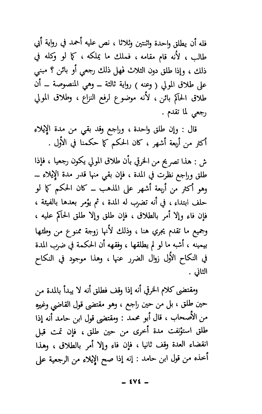 ش: هذا تصريح من الخرقي بأن طلاق المولي يكون رجعيا، فإذا طلق وراجع نظرت في المدة، فإن بقي منها قدر مدة الإيلاء - وهو أكثر من أربعة أشهر على المذهب - كان الحكم كما لو حلف ابتداء، في أنه تضرب له المدة، ثم يؤمر بعدها بالفيئة، فإن فاء وإلا أمر بالطلاق، فإن طلق وإلا طلق الحاكم عليه، وجميع ما تقدم يجري هنا، وذلك لأنها زوجة ممنوع من وطئها بيمينه، أشبه ما لو لم يطلقها، وفقهه أن الحكمة في ضرب المدة في النكاح الأول زوال الضرر عنها، وهذا موجود في النكاح الثاني.