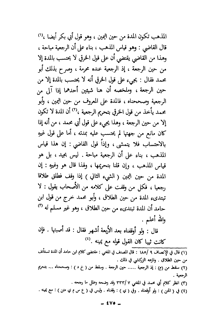 المذهب تكون المدة من حين اليمين، وهو قول أبي بكر أيضا، قال القاضي: وهو قياس المذهب، بناء على أن الرجعية مباحة، وهذا من القاضي يقتضي أن على قول الخرقي لا يحتسب بالمدة إلا من حين الرجعة، إذ الرجعية عنده محرمة، وصرح بذلك أبو محمد فقال: يجيء على قول الخرقي أنه لا يحتسب بالمدة إلا من حين الرجعة، وملخصه أن هنا شيئين أحدهما إذا آلى من الرجعية وصححناه، فالمدة على المعروف من حين اليمين، وأبو محمد يأخذ من قول الخرقي بتحريم الرجعية، أن المدة لا تكون إلا من حين الرجعة، وهذا يجيء على قول أبي محمد، من أنه إذا كان مانع من جهتها لم يحتسب عليه بمدته، أما على قول غيره بالاحتساب فلا يتمشى، وإذا قول القاضي: إن هذا قياس المذهب، بناء على أن الرجعية مباحة. ليس بجيد، بل هو قياس المذهب، وإن قلنا بتحريمها، ولهذا قال هو وغيره: إن المدة من حين اليمين (الشيء الثاني) إذا وقف فطلق طلاقا رجعيا، فكل من وقفت على كلامه من الأصحاب يقول: لا تبتدئ المدة من حين الطلاق، وأبو محمد خرج من قول ابن حامد أن المدة تبتدئ من حين الطلاق، وهو غير مسلم له، والله أعلم.