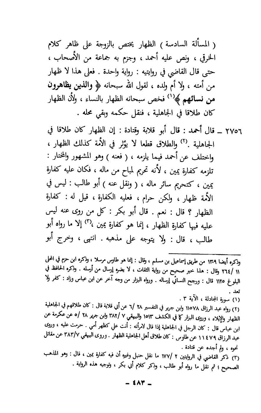 2756 - قال أحمد: قال أبو قلابة وقتادة: إن الظهار كان طلاقا في الجاهلية. والطلاق قطعا لا يؤثر في الأمة كذلك الظهار، واختلف عن أحمد فيما يلزمه، (فعنه) وهو المشهور والمختار: تلزمه كفارة يمين، لأنه تحريم لمباح من ماله، فكان عليه كفارة يمين، كتحريم سائر ماله، (ونقل عنه) أبو طالب: ليس في الأمة ظهار، ولكن حرام، فعليه الكفارة، قيل له: كفارة الظهار؟ قال: نعم. قال أبو بكر: كل من روى عنه ليس عليه فيها كفارة الظهار، إنما هو كفارة يمين، إلا ما رواه أبو طالب، قال: ولا يتوجه على مذهبه. انتهى، وخرج أبو