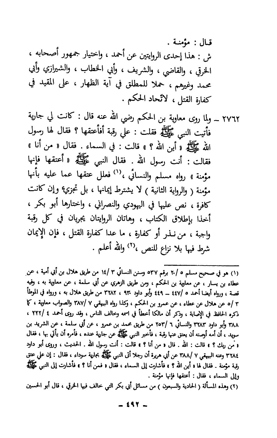 2762 - ولما روى «معاوية بن الحكم - رَضِيَ اللَّهُ عَنْهُ - قال: كانت لي جارية فأتيت النبي - صَلَّى اللَّهُ عَلَيْهِ وَسَلَّمَ - فقلت: علي رقبة أفأعتقها؟ فقال لها رسول الله - صَلَّى اللَّهُ عَلَيْهِ وَسَلَّمَ -: «أين الله؟» قالت: في السماء. فقال: «من أنا» فقالت: أنت رسول الله. فقال النبي - صَلَّى اللَّهُ عَلَيْهِ وَسَلَّمَ -: «أعتقها فإنها مؤمنة» رواه مسلم والنسائي، فعلل عتقها عما عليه بأنها مؤمنة (والرواية الثانية) لا يشترط إيمانها، بل تجزئ وإن كانت كافرة، نص عليها في اليهودي والنصراني، واختارها أبو بكر، أخذا بإطلاق الكتاب، وهاتان الروايتان يجريان في كل رقبة واجبة، من نذر أو كفارة، ما عدا كفارة القتل، فإن الإيمان شرط فيها بلا نزاع للنص، والله أعلم.