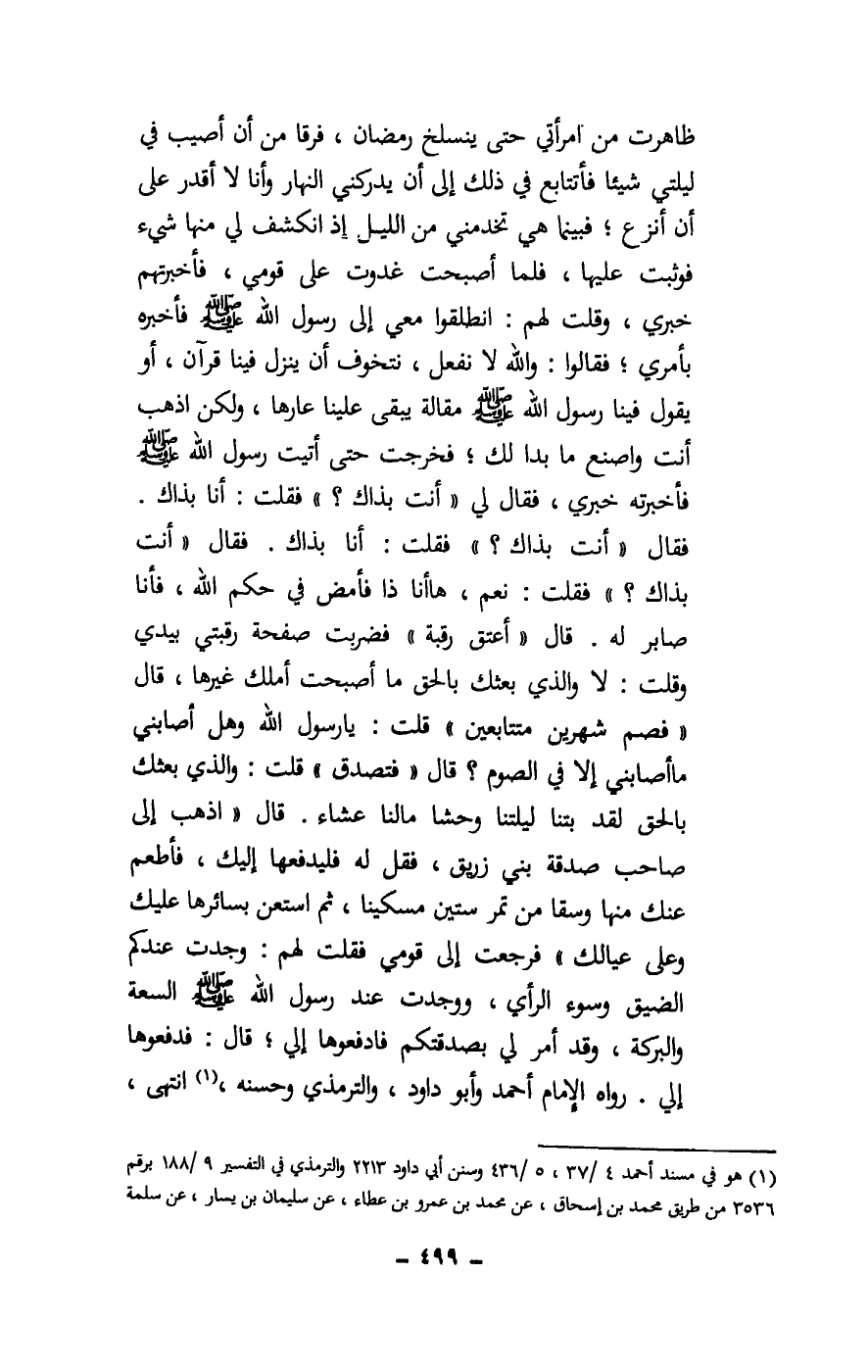ظاهرت من امرأتي حتى ينسلخ رمضان، فرقا من أن أصيب في ليلتي شيئا فأتتابع في ذلك إلى أن يدركني النهار وأنا لا أقدر على أن أنزع؛ فبينما هي تخدمني من الليل إذ انكشف لي منها شيء فوثبت عليها، فلما أصبحت غدوت على قومي، فأخبرتهم خبري، وقلت لهم: انطلقوا معي إلى رسول الله - صَلَّى اللَّهُ عَلَيْهِ وَسَلَّمَ - فأخبره بأمري؛ فقالوا: والله لا نفعل، نتخوف أن ينزل فينا قرآن، أو يقول فينا رسول الله - صَلَّى اللَّهُ عَلَيْهِ وَسَلَّمَ - مقالة يبقى علينا عارها، ولكن اذهب أنت واصنع ما بدا لك؛ فخرجت حتى أتيت رسول الله - صَلَّى اللَّهُ عَلَيْهِ وَسَلَّمَ - فأخبرته خبري، فقال لي: «أنت بذاك؟» فقلت: أنا بذاك. فقال: «أنت بذاك؟» فقلت: نعم، ها أنا ذا فأمض في حكم الله، فأنا صابر له. قال: «أعتق رقبة» فضربت صفحة رقبتي بيدي وقلت: لا والذي بعثك بالحق ما أصبحت أملك غيرها، قال: «فصم شهرين متتابعين» قلت: يا رسول الله وهل أصابني ما أصابني إلا في الصوم؟ قال: «فتصدق» قلت: والذي بعثك بالحق لقد بتنا ليلتنا وحشا ما لنا عشاء. قال: «اذهب إلى صاحب صدقة بني زريق، فقل له فليدفعها إليك، فأطعم عنك منها وسقا من تمر ستين مسكينا، ثم استعن بسائرها عليك وعلى عيالك» فرجعت إلى قومي فقلت لهم: وجدت عندكم الضيق وسوء الرأي، ووجدت عند رسول الله - صَلَّى اللَّهُ عَلَيْهِ وَسَلَّمَ - السعة والبركة، وقد أمر لي بصدقتكم فادفعوها إلي؛ قال: فدفعوها إلي» . رواه الإمام أحمد وأبو داود، والترمذي وحسنه، انتهى،