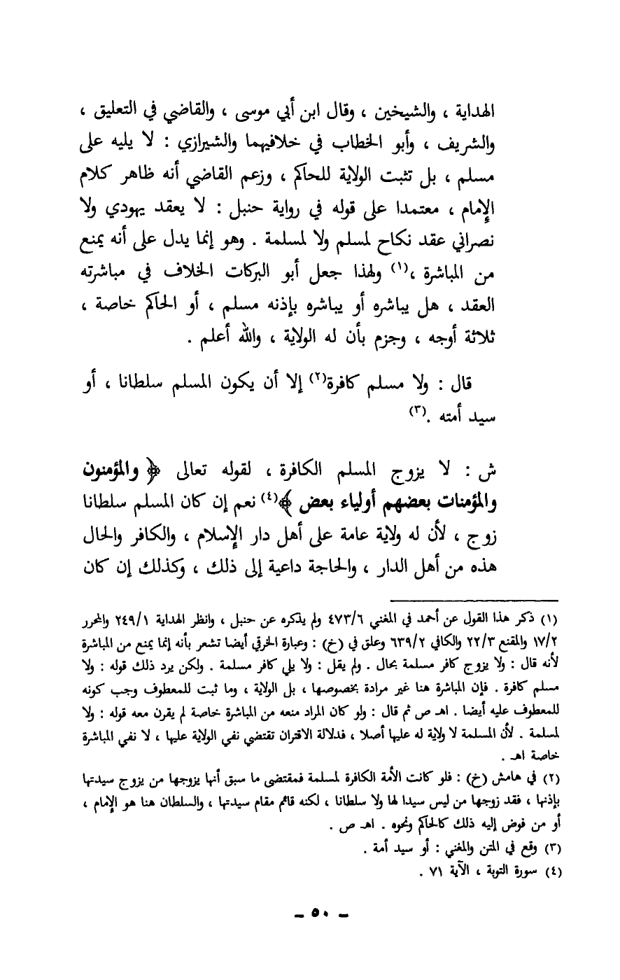 ش: لا يزوج المسلم الكافرة، لِقَوْلِهِ تَعَالَى: {وَالْمُؤْمِنُونَ وَالْمُؤْمِنَاتُ بَعْضُهُمْ أَوْلِيَاءُ بَعْضٍ} [التوبة: 71] نعم إن كان المسلم سلطانا زوج، لأن له ولاية عامة على أهل دار الإسلام، والكافر والحال هذه من أهل الدار، والحاجة داعية إلى ذلك، وكذلك إن كان