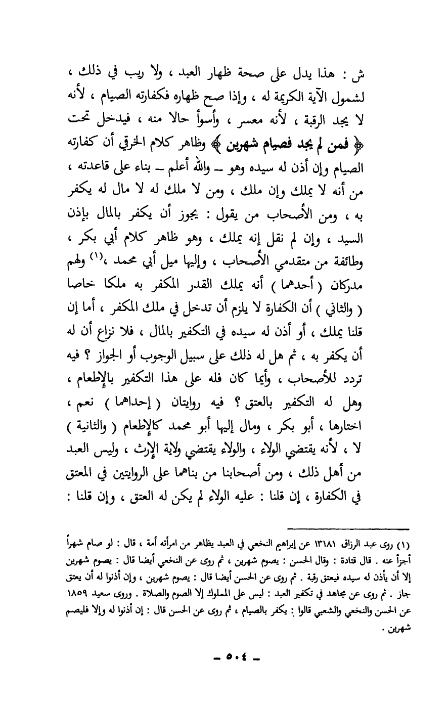 ش: هذا يدل على صحة ظهار العبد، ولا ريب في ذلك، لشمول الآية الكريمة له، وإذا صح ظهاره فكفارته الصيام، لأنه لا يجد الرقبة، لأنه معسر، وأسوأ حالا منه، فيدخل تحت: {فَمَنْ لَمْ يَجِدْ فَصِيَامُ شَهْرَيْنِ} [المجادلة: 4] وظاهر كلام الخرقي أن كفارته الصيام وإن أذن له سيده وهو - والله أعلم - بناء على قاعدته، من أنه لا يملك وإن ملك، ومن لا ملك له لا مال له يكفر به، ومن الأصحاب من يقول: يجوز أن يكفر بالمال بإذن السيد، وإن لم نقل إنه يملك، وهو ظاهر كلام أبي بكر، وطائفة من متقدمي الأصحاب، وإليها ميل أبي محمد، ولهم مدركان (أحدهما) : أنه يملك القدر المكفر به ملكا خاصا (والثاني) : أن الكفارة لا يلزم أن تدخل في ملك المكفر، أما إن قلنا يملك، أو أذن له سيده في التكفير بالمال، فلا نزاع أن له أن يكفر به، ثم هل له ذلك على سبيل الوجوب أو الجواز؟ فيه تردد للأصحاب، وأيما كان فله على هذا التكفير بالإطعام، وهل له التفكير بالعتق؟ فيه روايتان (إحداهما) : نعم، اختارها، أبو بكر، ومال إليها أبو محمد كالإطعام (والثانية) : لا، لأنه يقتضي الولاء، والولاء يقتضي ولاية الإرث، وليس العبد من أهل ذلك، ومن أصحابنا من بناهما على الروايتين في المعتق في الكفارة، إن قلنا: عليه الولاء لم يكن له العتق، وإن قلنا: