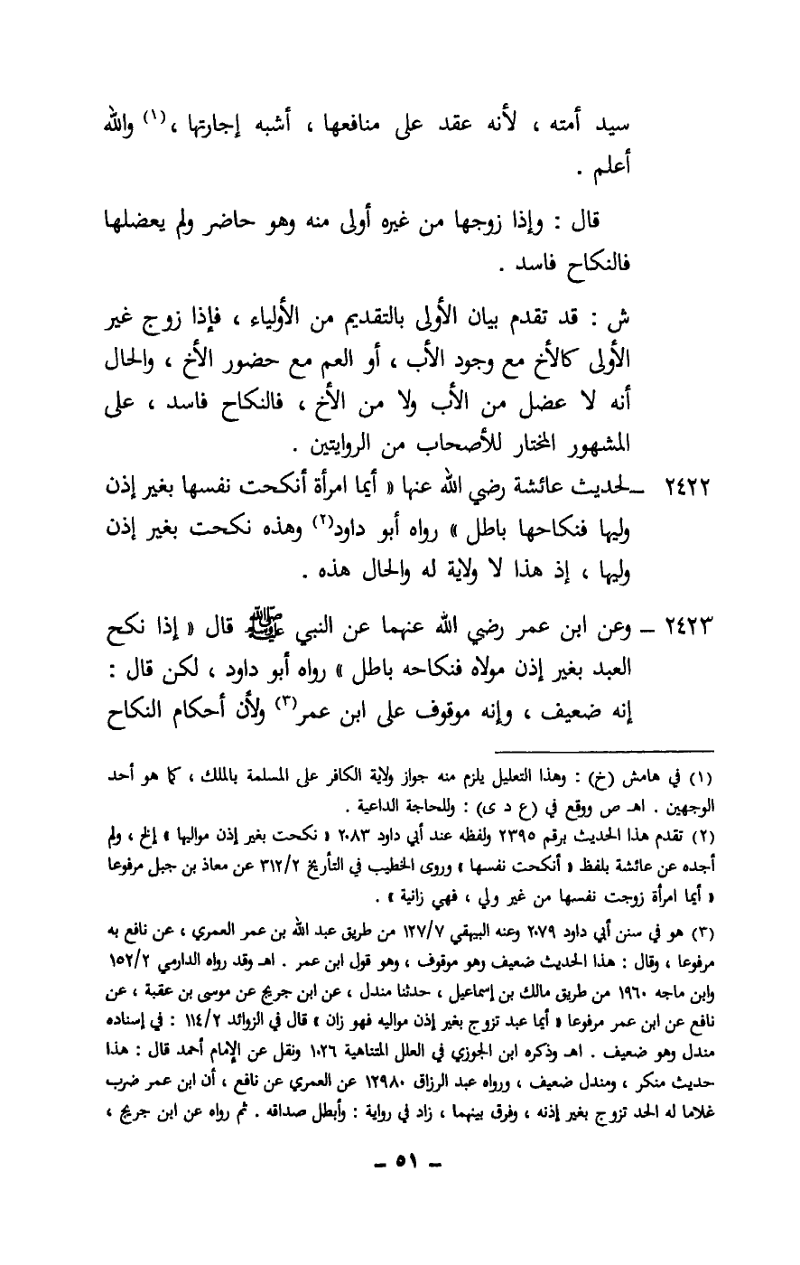 2423 - وعن ابن عمر - رَضِيَ اللَّهُ عَنْهُمَا - عن النبي - صَلَّى اللَّهُ عَلَيْهِ وَسَلَّمَ - قال: «إذا نكح العبد بغير إذن مولاه فنكاحه باطل» رواه أبو داود، لكن قال: إنه ضعيف، وإنه موقوف على ابن عمر ولأن أحكام النكاح
